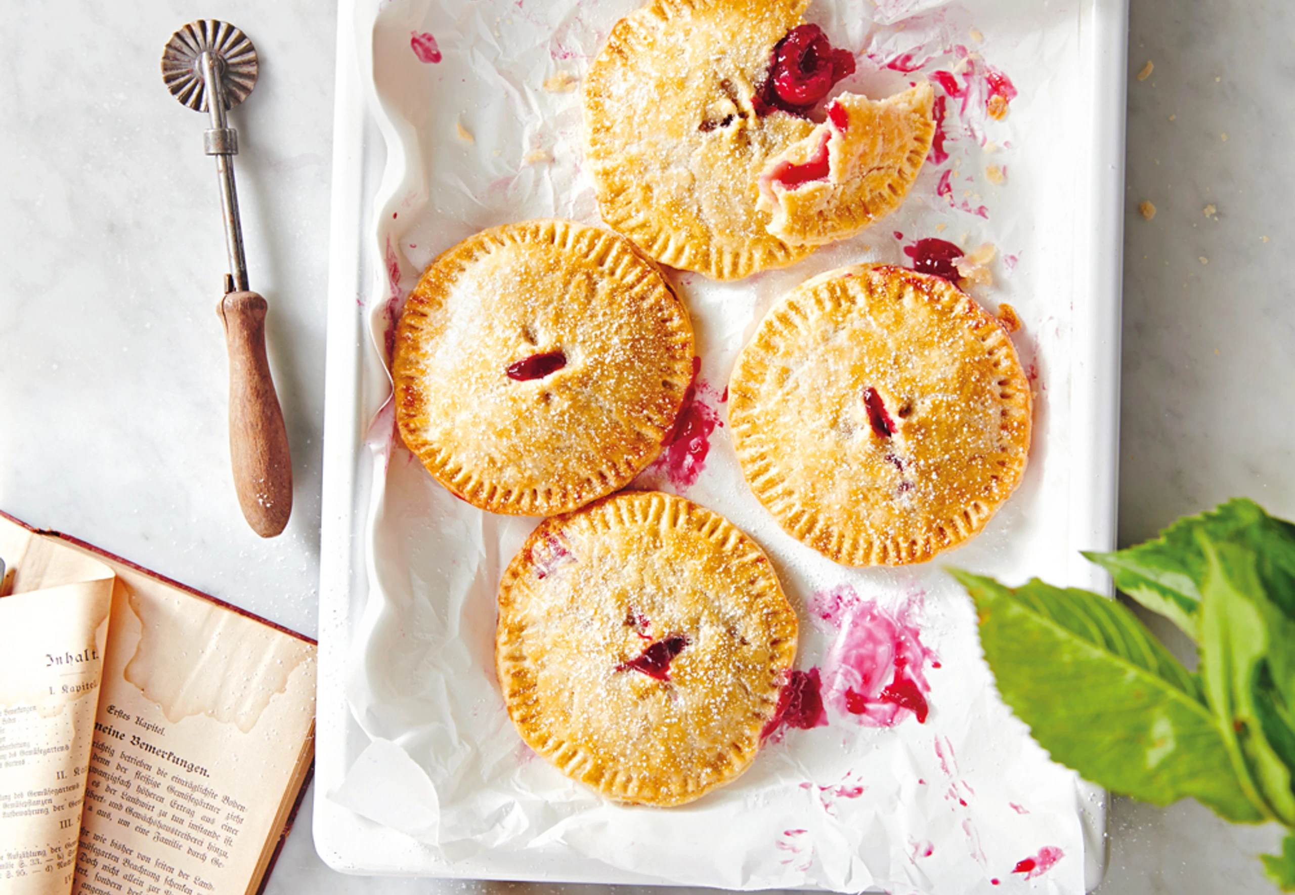 Rohr auf 200°C vorheizen. Backblech mit Backpapier belegen. Teig auf einer bemehlten Arbeitsfläche ausrollen. 16 Scheiben (Ø 12 cm) ausstechen. Je 1 gehäuften EL Kirschen mittig auf 8 Teigscheiben platzieren. Übrige Teigscheiben darauflegen und den Rand mit einer Gabel andrücken. Pies auf das Blech legen und mit Ei bestreichen. Die Mitte kreuzweise einschneiden. Pies im Rohr (mittlere Schiene) ca. 22 Minuten goldbraun backen. Herausnehmen und mit Staubzucker bestreuen.