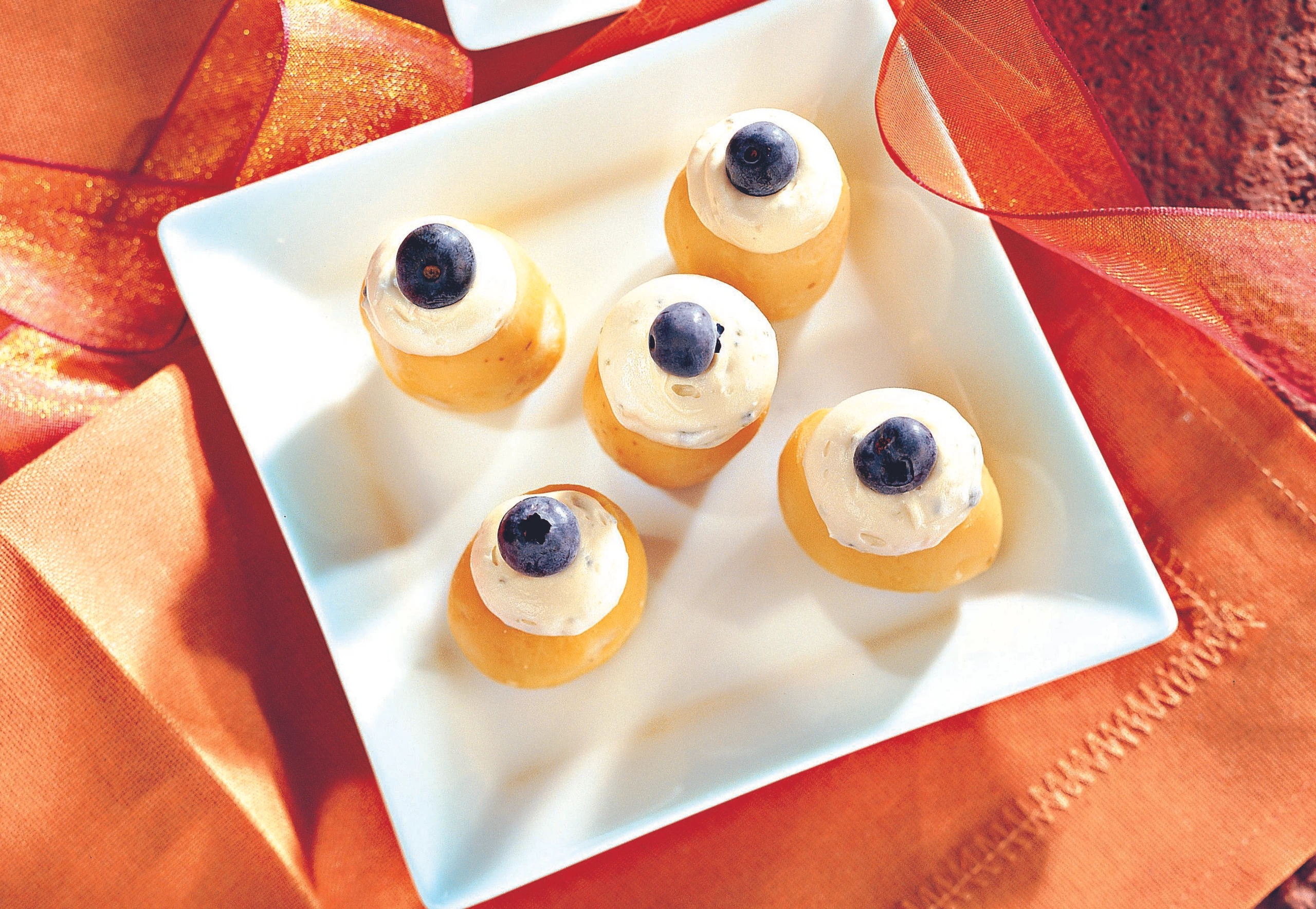 - Käse mit der Gabel zerdrücken, mit Gervais und Milch mit dem Hand-mixer gut schaumig rühren. Erdäpfel mit der Käsemasse füllen und mit den übrigen Heidelbeeren garnieren.