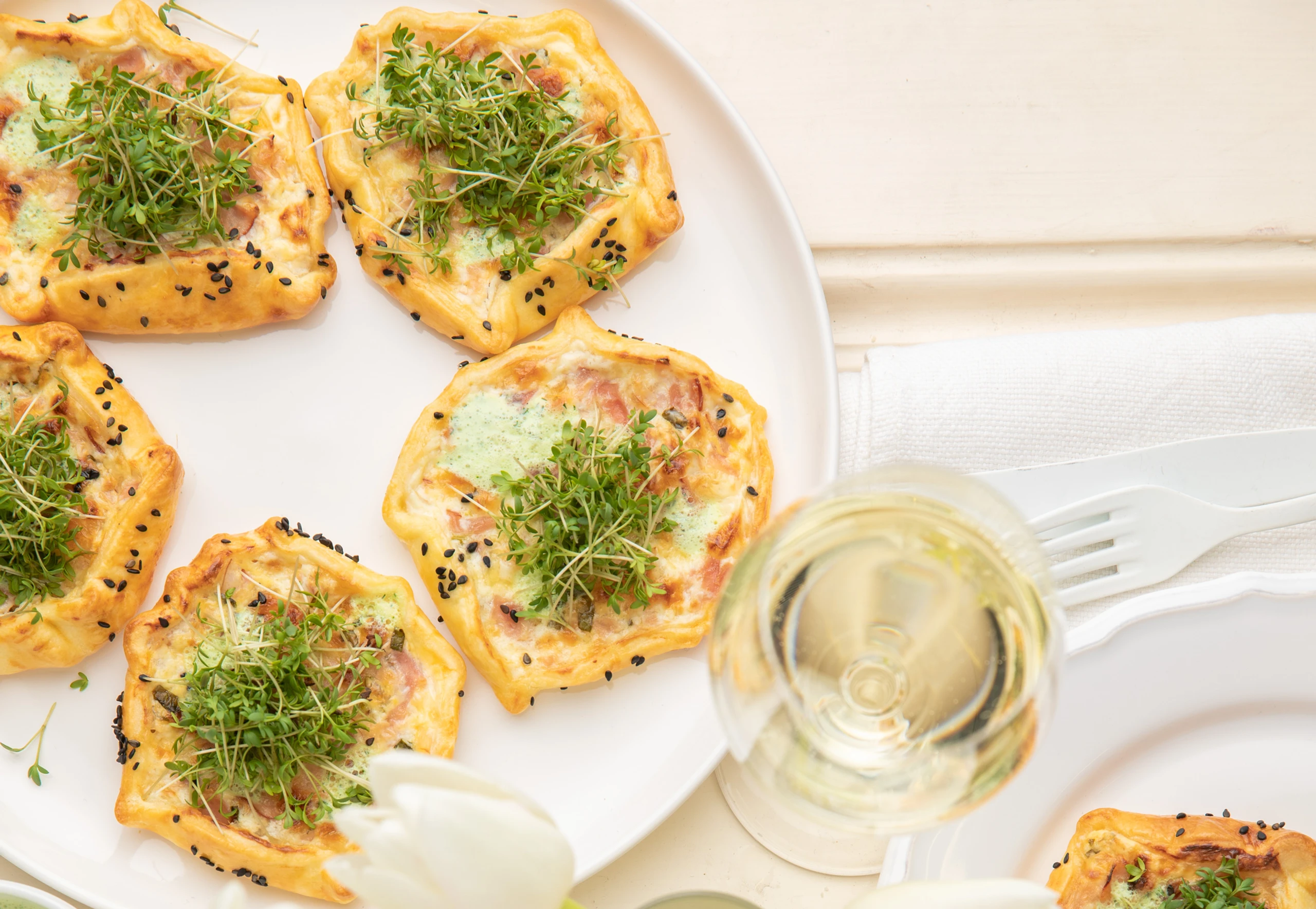 Mini-Galettes mit Schinken, Emmentaler und Kresse