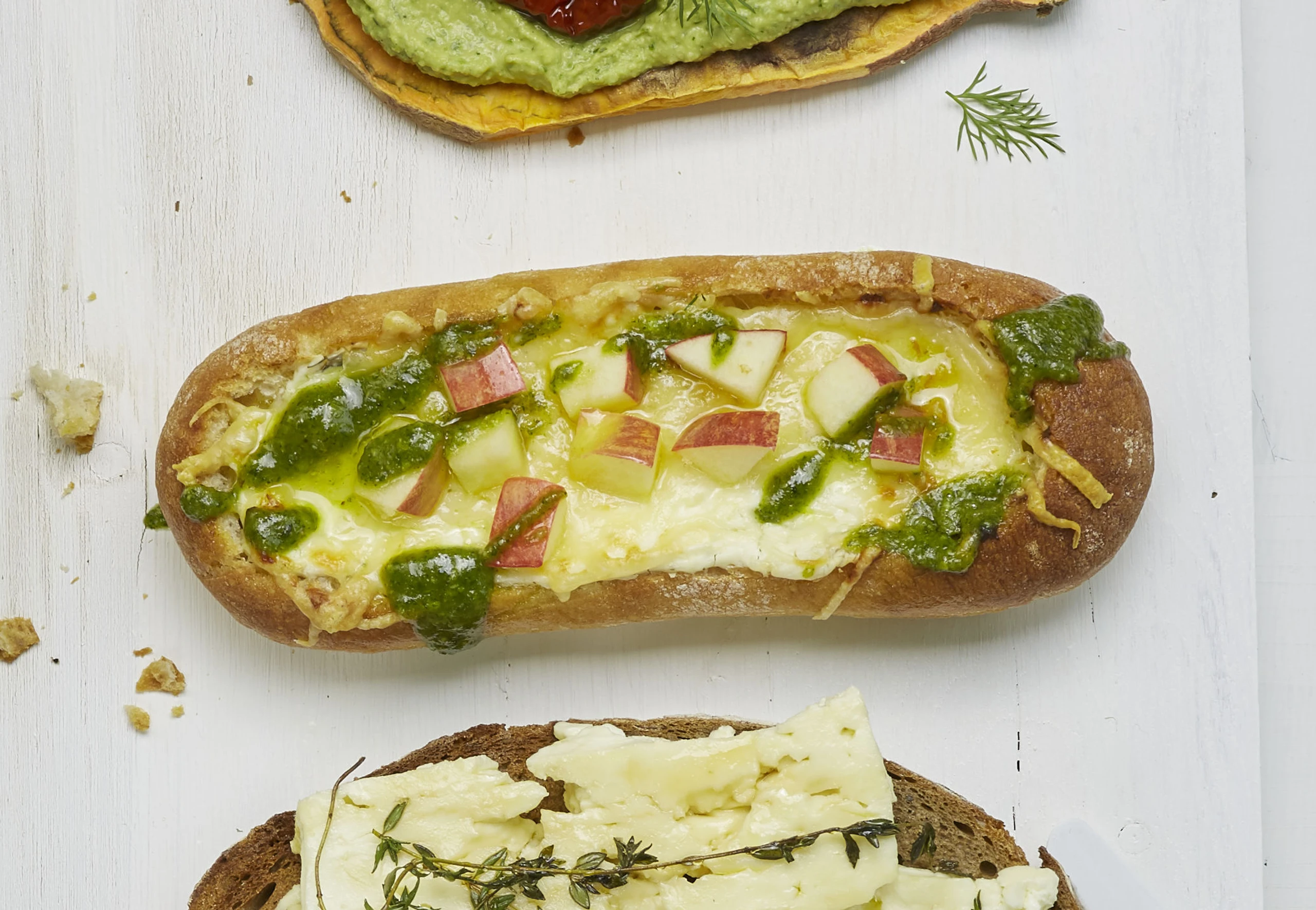 Apfel in kleine Würfel schneiden. Baguettes mit Apfelwürfeln bestreuen und mit Pesto beträufeln.