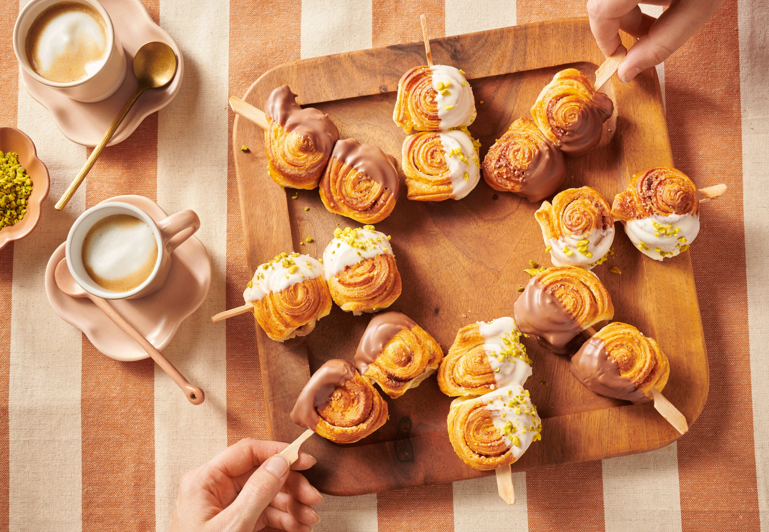 Für die Deko Kuvertüresorten über einem Wasserbad schmelzen. Rolls mit der Kuvertüre und den Pistazien verzieren.