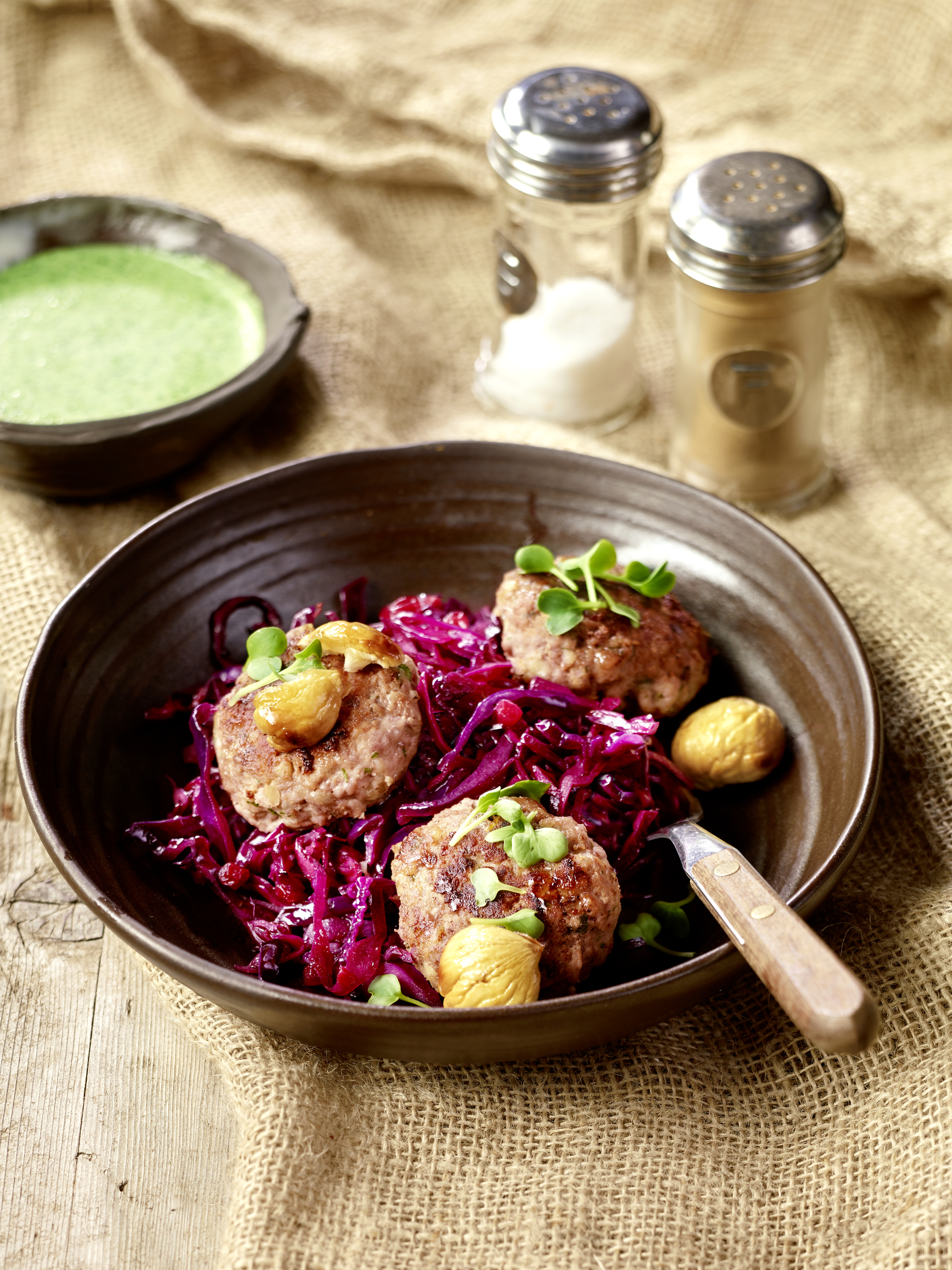 Für die Laibchen die Hälfte von den Maroni klein hacken. Faschiertes mit gehackten Maroni, Obers, Ei, Petersilie und Orangenschale vermischen. Masse mit Salz, Pfeffer und Thymian würzen. Aus der Masse 12 Laibchen formen.