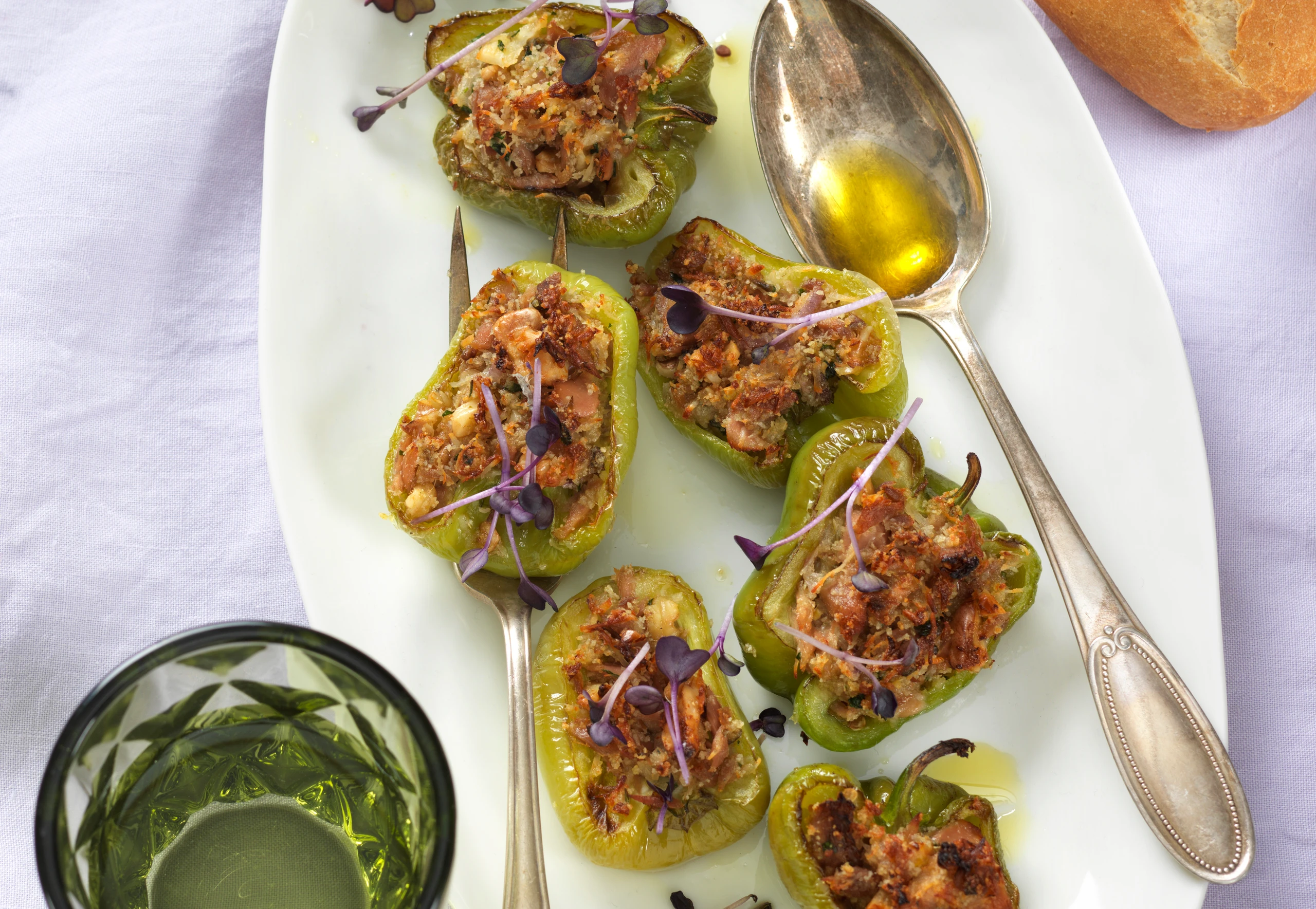 - Für die Fülle Thunfisch und Kapern gut abtropfen lassen. Thunfisch in kleine Stücke zupfen. Zwiebeln und Knoblauch schälen. Zwiebeln, Knoblauch und Kapern klein schneiden und in 2 EL vom Öl anschwitzen. Petersilie zugeben und kurz mitrösten. Mischung umfüllen, Thunfisch, Brösel, Nüsse und Halloumi unterrühren und die Masse salzen und pfeffern.