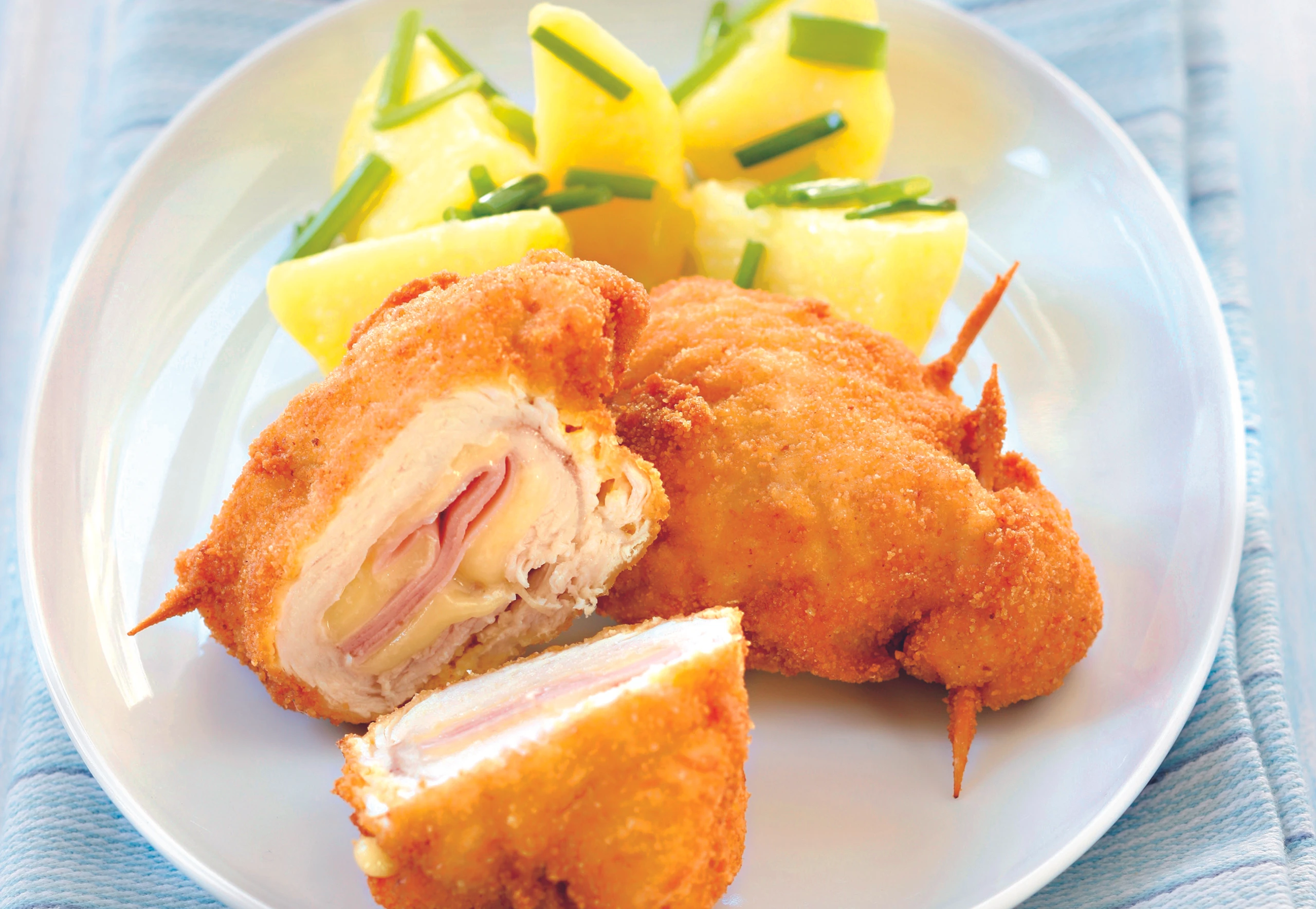 - Unbelegte Fleischhälfte über die Fülle klappen, Ränder zusammendrücken, mit Zahnstochern verschließen. Schnitzel in Mehl, Ei und Bröseln panieren.
