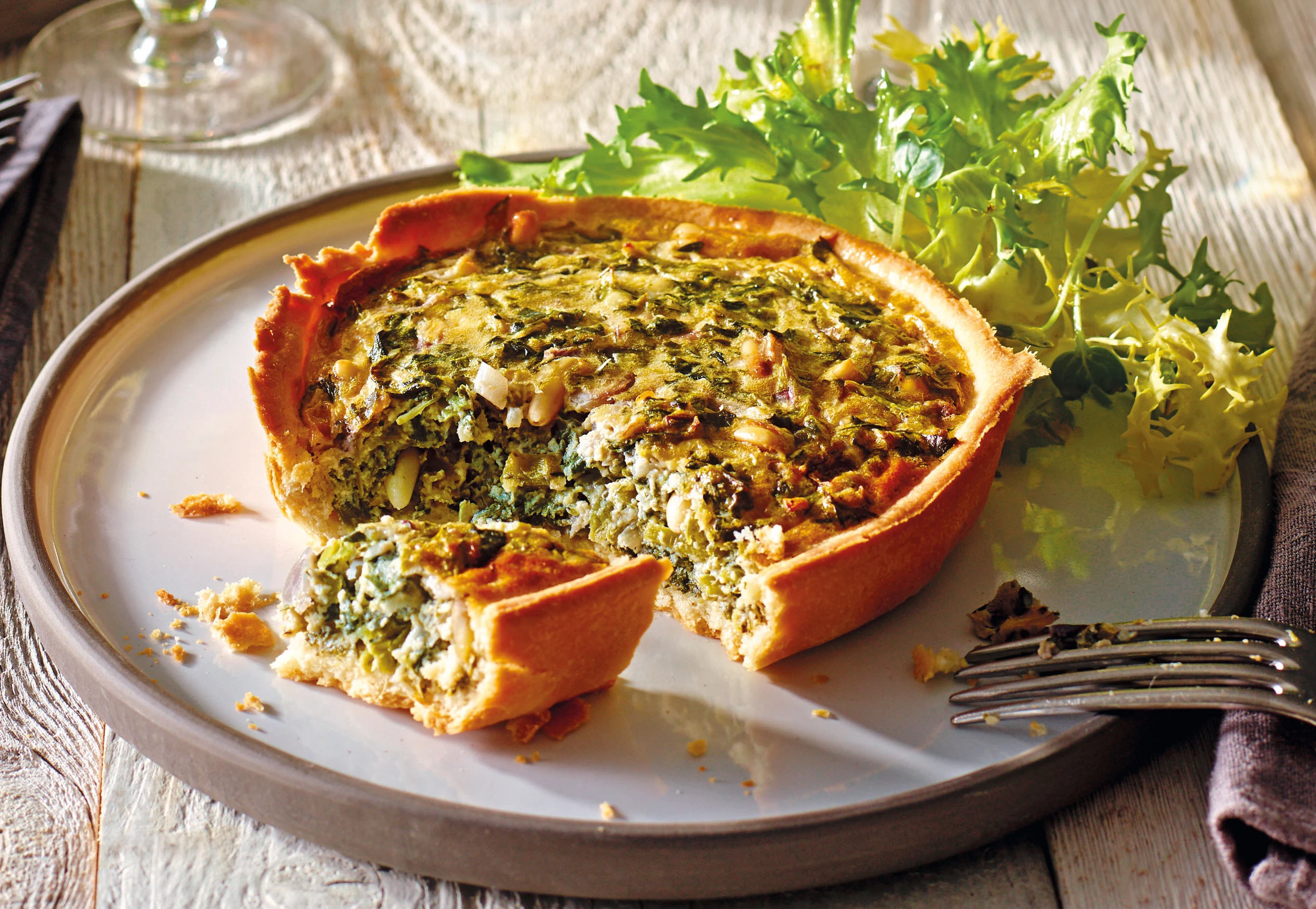Salat putzen und zerpflücken. Für die Marinade Balsamico salzen und pfeffern. Öl einrühren. Salat mit der Marinade vermischen. Quiches aus dem Rohr nehmen und mit dem Salat servieren.