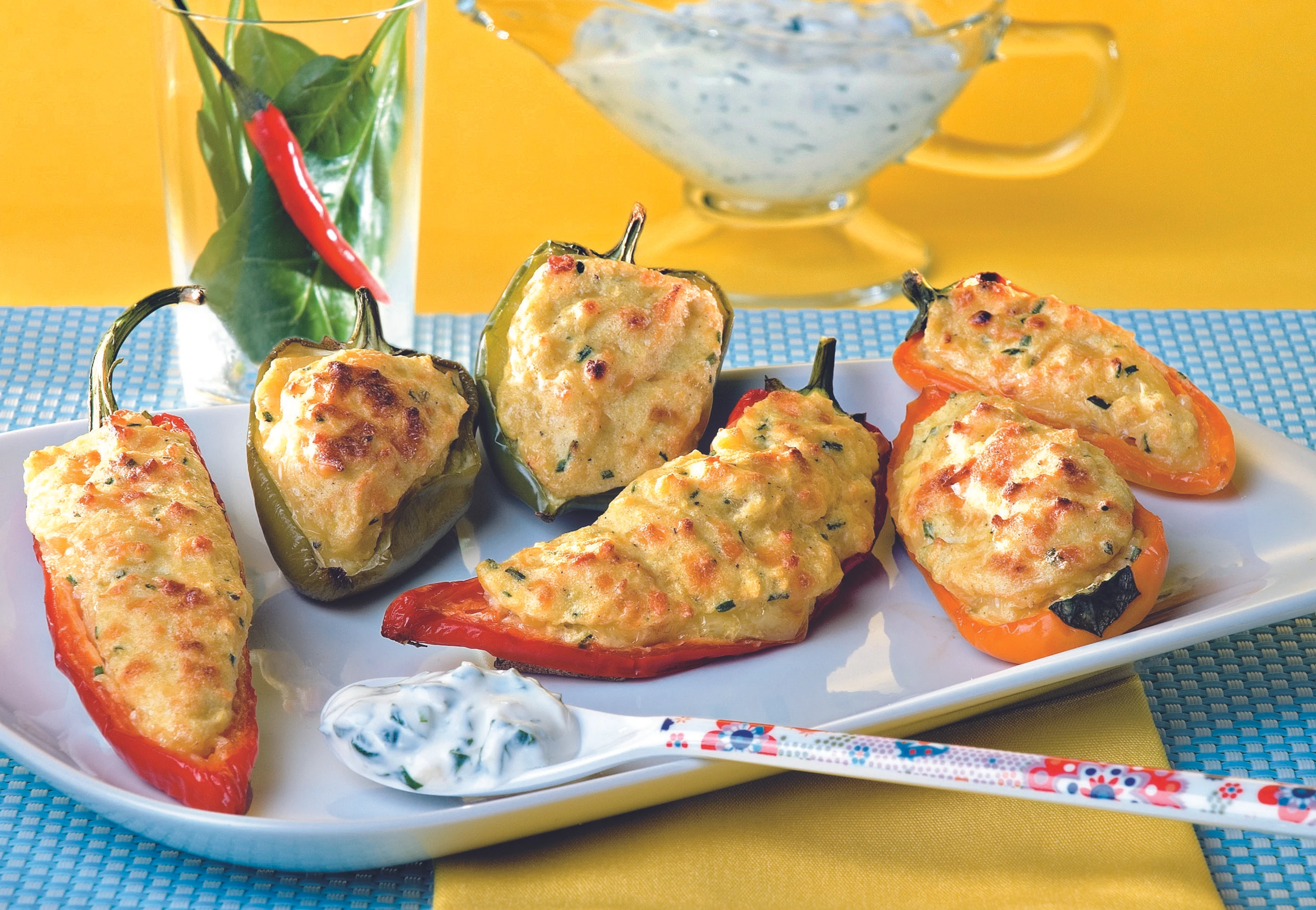 Paprika mit Masse füllen, auf das Blech legen und im Rohr ca. 15 Minuten backen. Paprika mit der Sauce servieren.