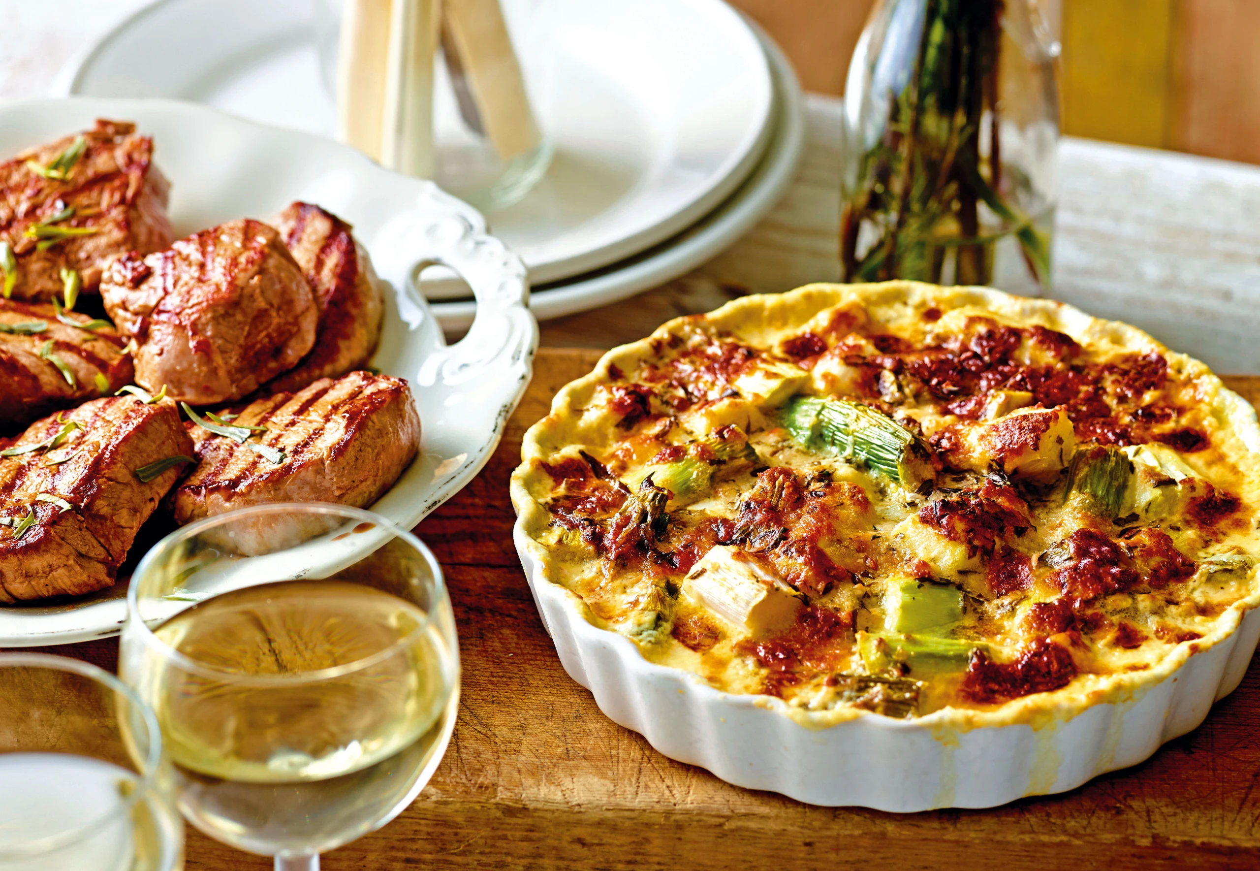 Steaks mit der Sauce anrichten, mit Estragon bestreuen und mit dem Gratin servieren.