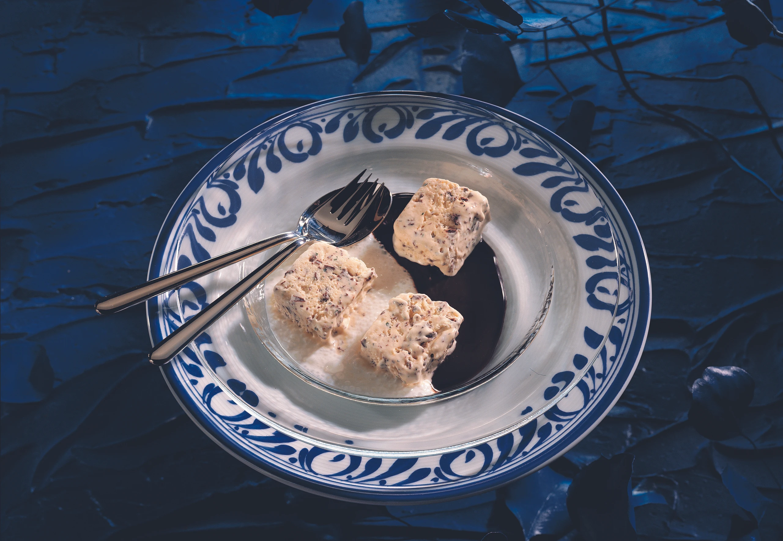 Parfait aus der Form stürzen. Folie abziehen. Parfait in Scheiben schneiden und mit Schokoladensauce und Sauerrahm anrichten.