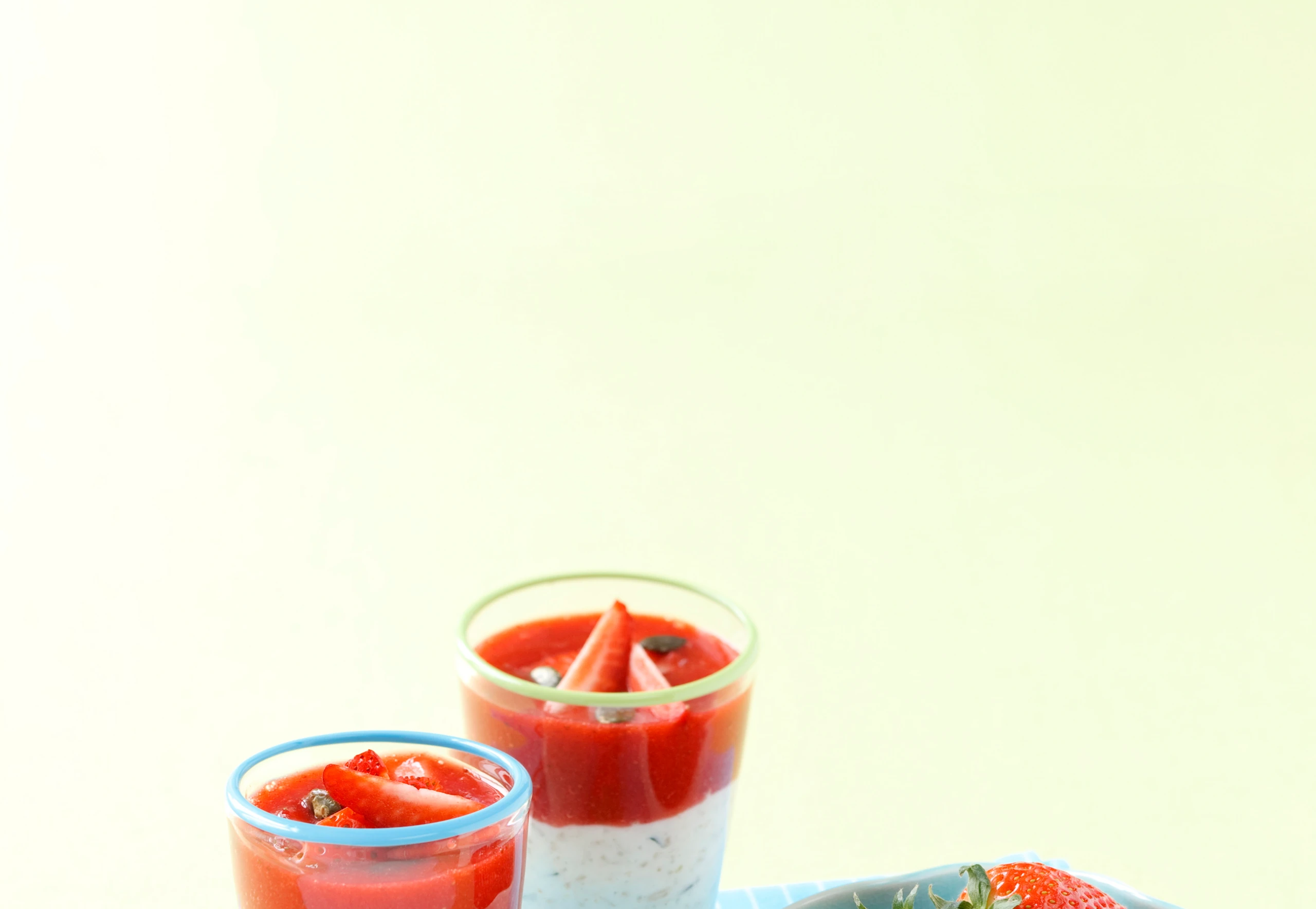 - Abwechselnd Erdbeersauce und Minzecreme in Gläser füllen. Eventuell mit frischer Minze garniert servieren.