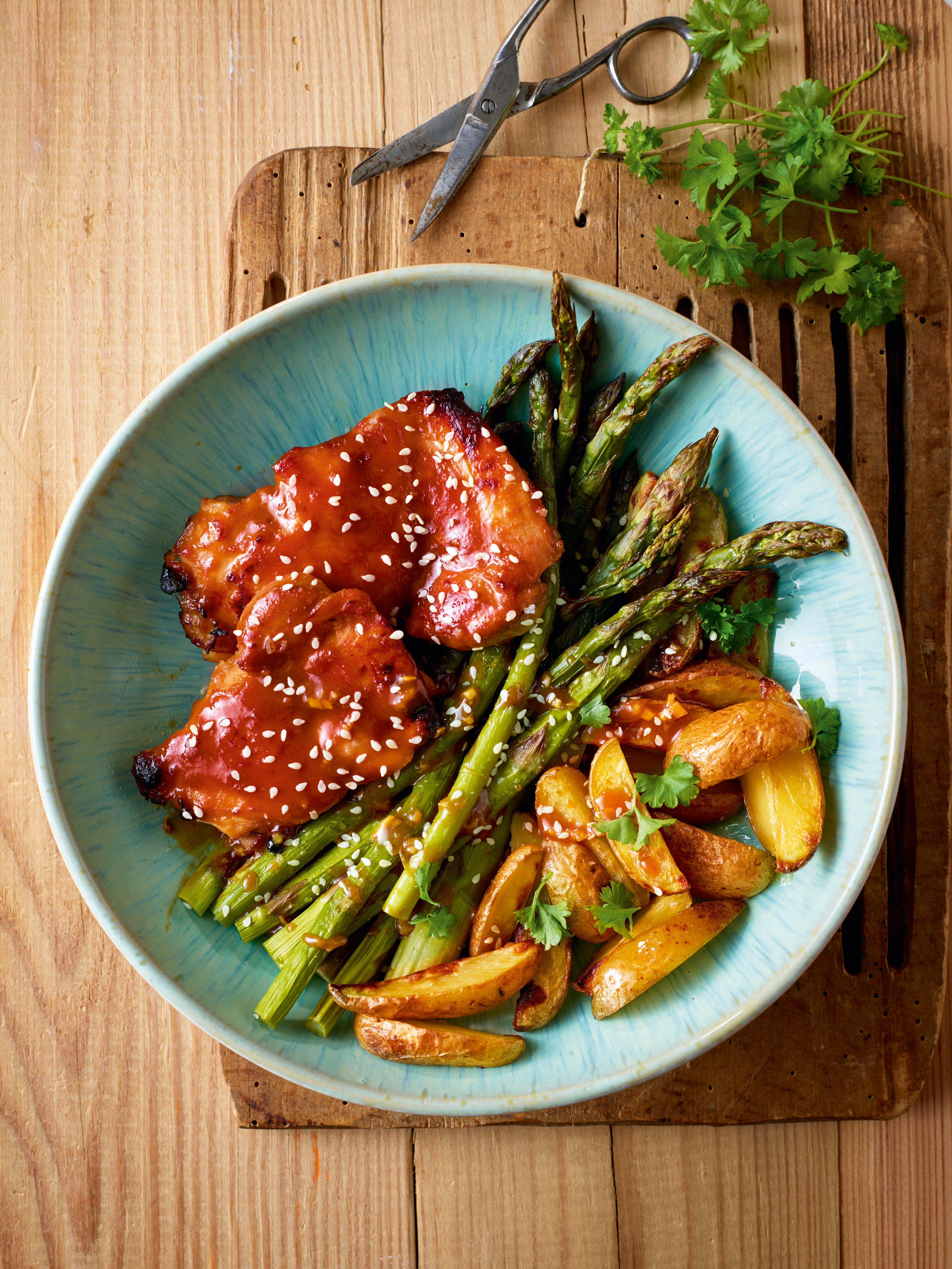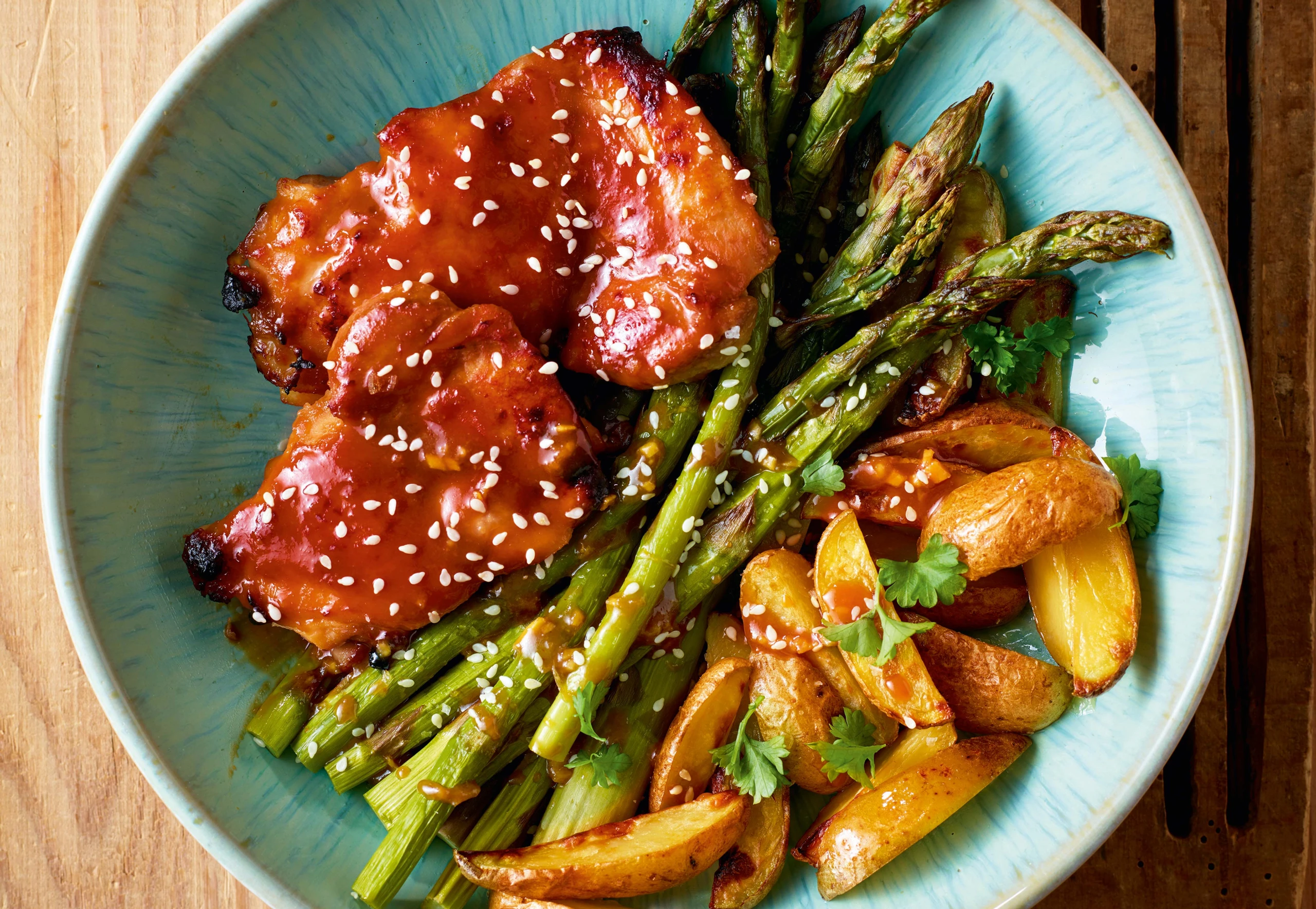 Miso-Honighühnchen mit grünem Spargel vom Blech