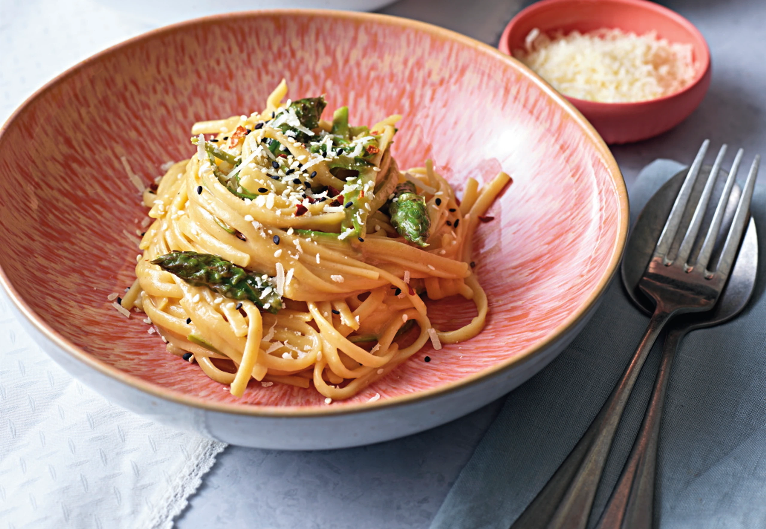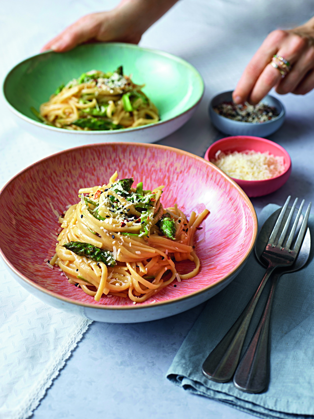 Nudeln und Spargel zugeben und mischen, bis alles mit der Misosauce überzogen ist. Parmesan und restliche Butter unterrühren.