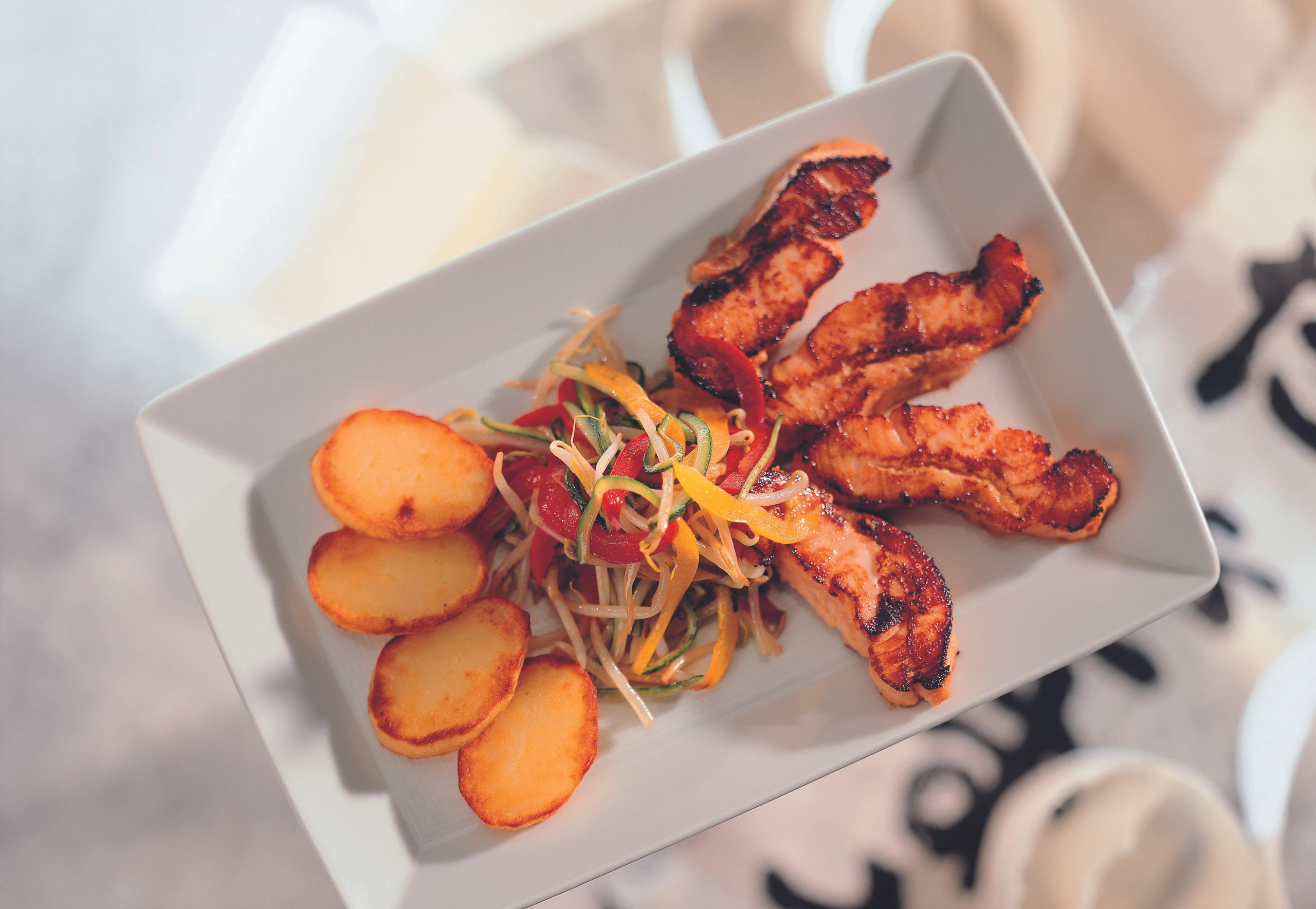 Lachsstücke mit dem vorher zubereiteten Streifengemüse und den Braterdäpfeln anrichten.