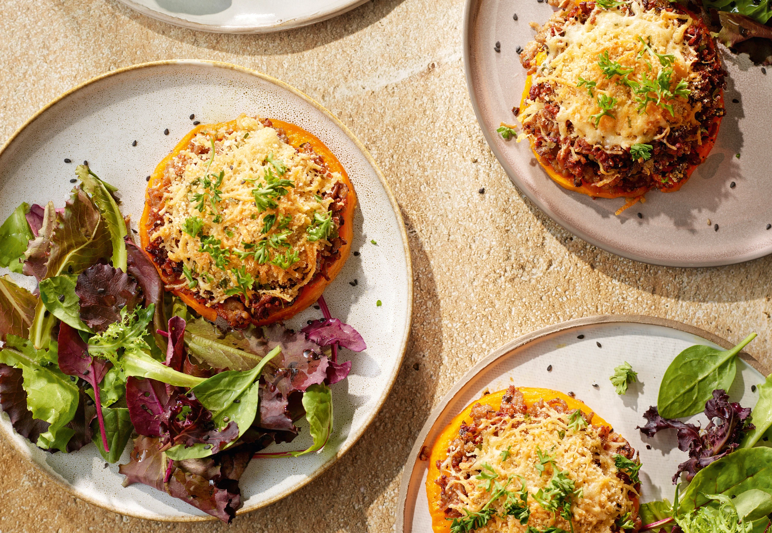 Kürbis aus dem Rohr nehmen, mit Fülle belegen, mit der Käse-Brösel-Mischung bestreuen und im Rohr (obere Schiene) ca. 15 Minuten goldbraun überbacken. Herausnehmen, anrichten und mit Petersilie garnieren. Dazu passt grüner Salat.