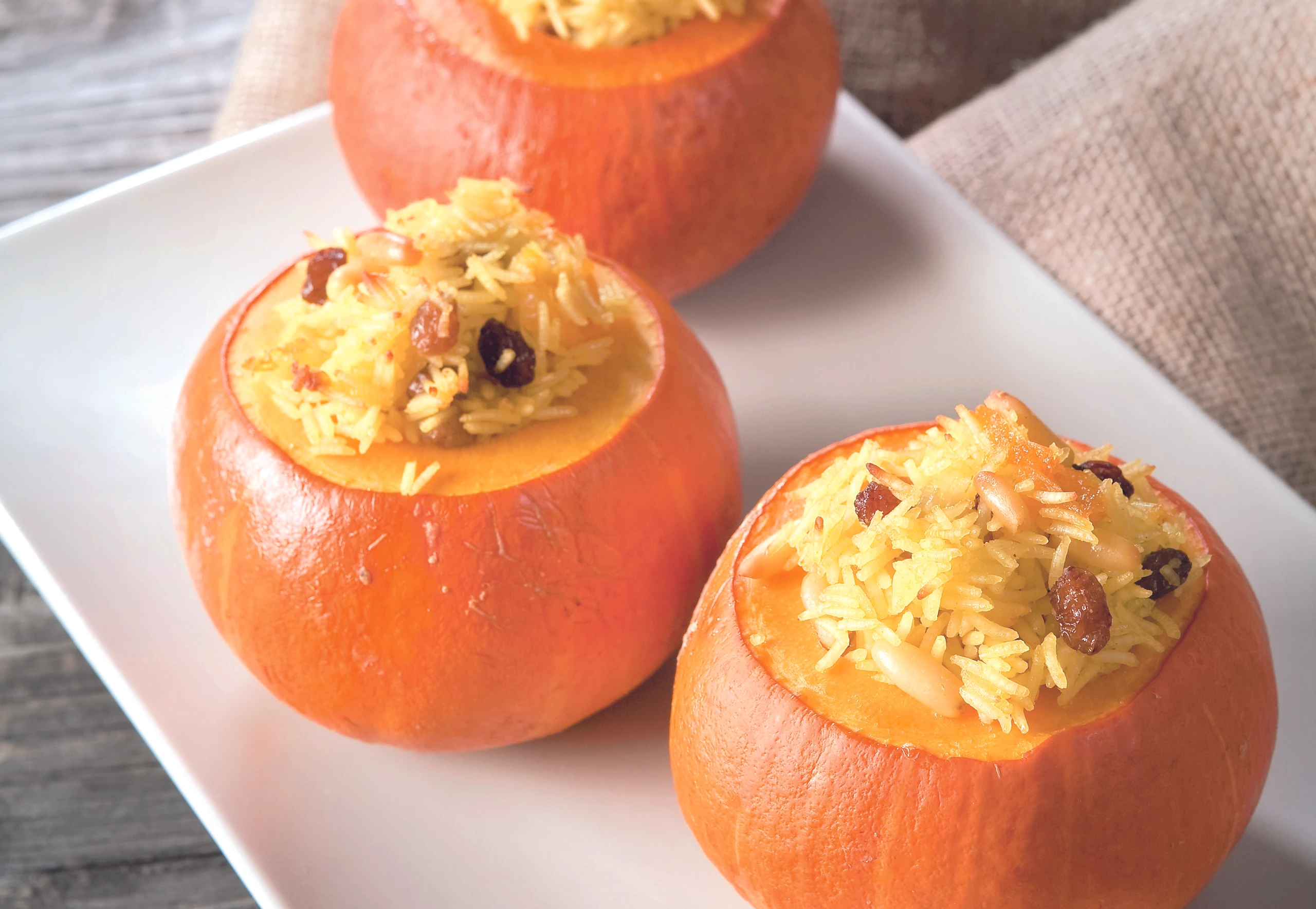 - Reis in die Kürbisse füllen und im Rohr ca. 40 Minuten - ohne "Deckel" - garen.