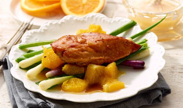 Jungzwiebeln und Orangen auf Tellern anrichten, Hühnerfilets darauflegen, mit Bratflüssigkeit übergießen und servieren.