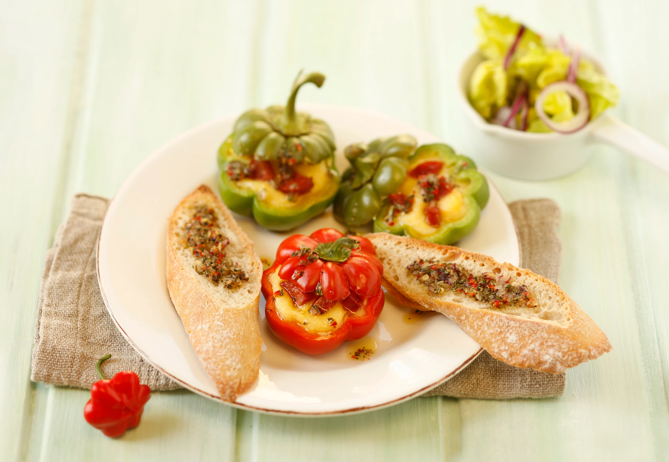 Paprika in eine Bratpfanne setzen und im Rohr (mittlere Schiene / Gitterrost) ca. 12 Minuten garen. Paprika herausnehmen, mit Chili-Crostini und grünem Salat servieren.