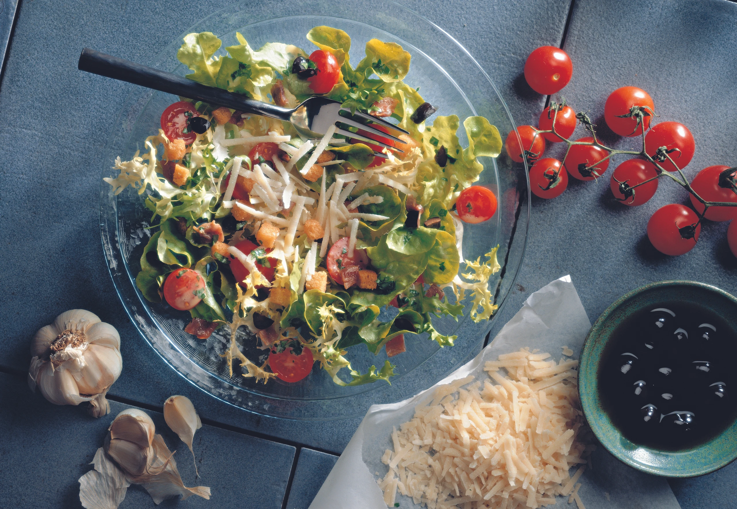- Salate, Paradeiser, Oliven und Sardellenfilets in eine Schüssel geben, mit Marinade beträufeln und behutsam durchmischen.