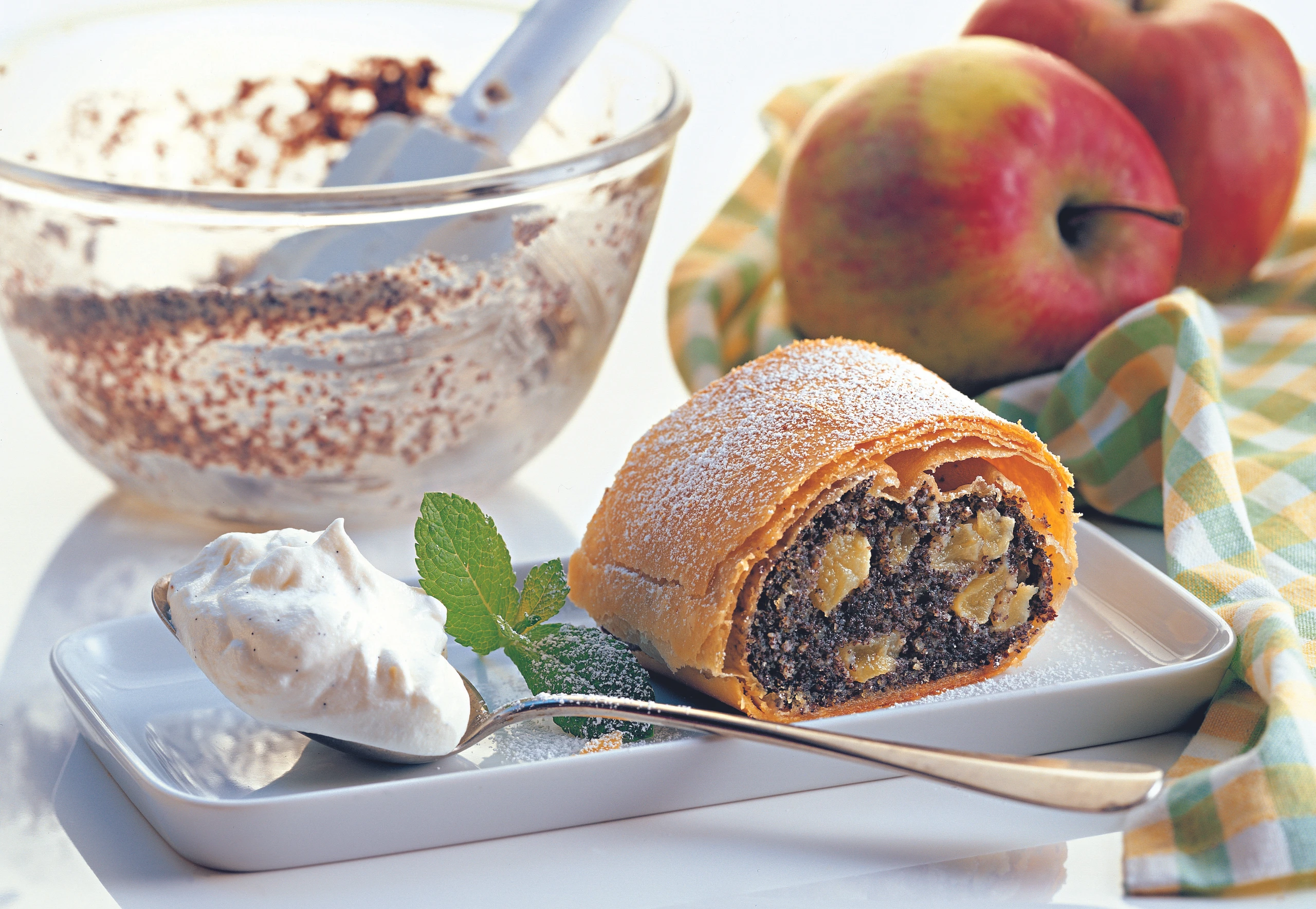 Apfel schälen, entkernen und in kleine Würfel schneiden. Milch aufkochen, Mohn und gehackte Schokolade einrühren und auskühlen lassen. Backrohr auf 180 °C vorheizen.
