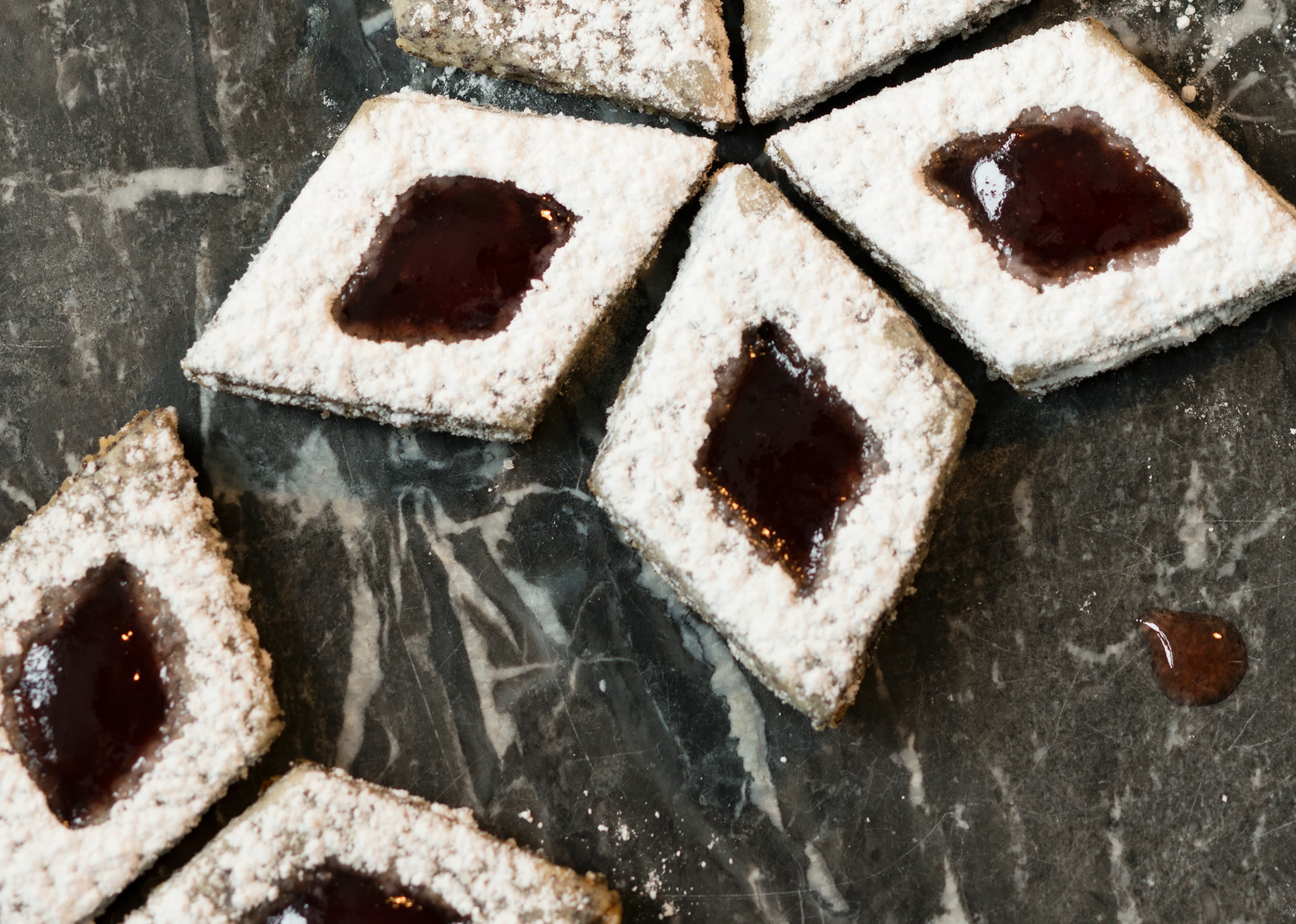 Die ungelochten Rauten mit Marmelade bestreichen, gelochte Scheiben mit Staubzucker bestreuen, mit einer bestrichenen Raute zusammensetzen.