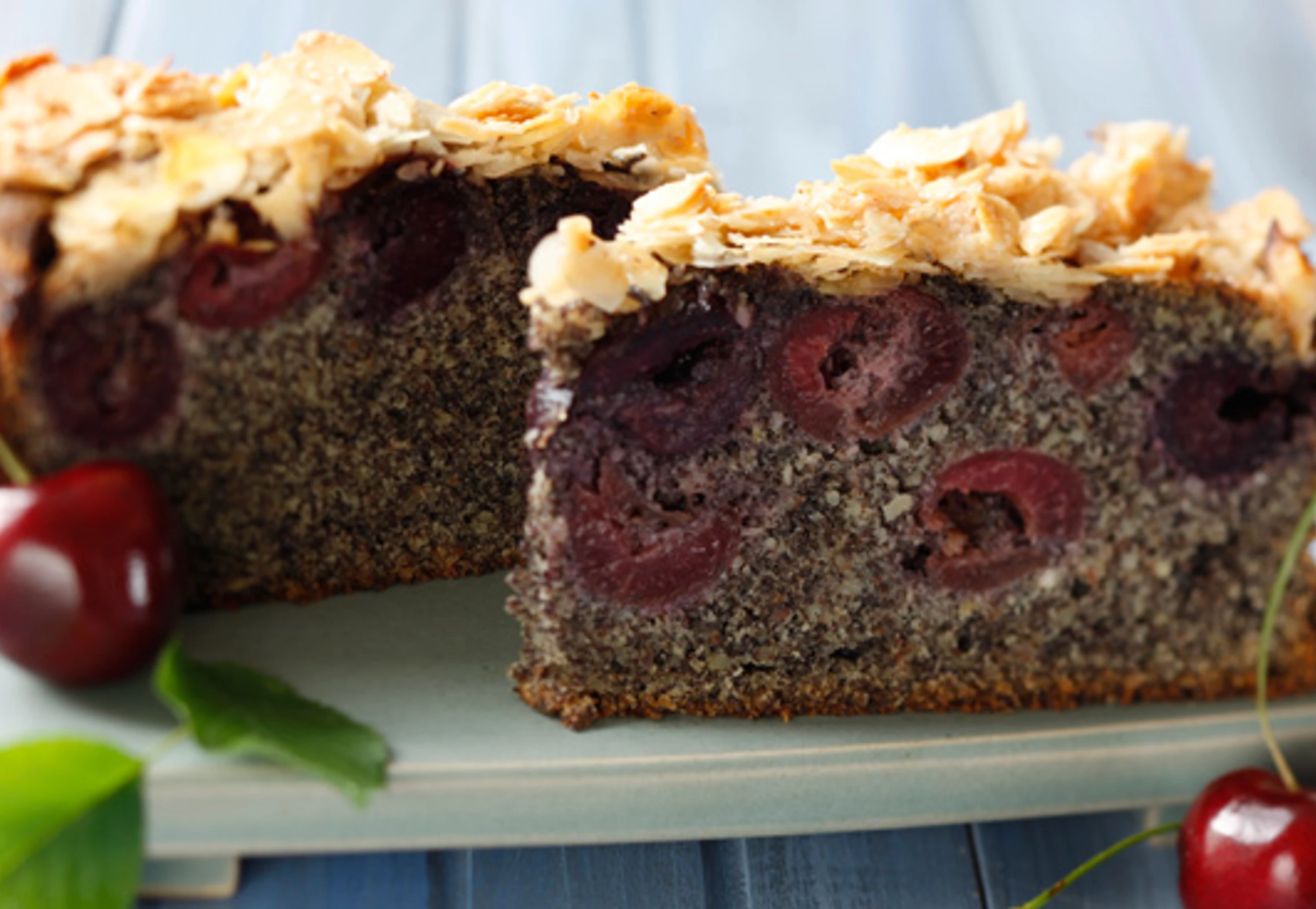 Mehl sieben, mit Mohn und Mandeln vermischen. Eier in Dotter und Klar trennen. Butter, Staubzucker, Vanillezucker, 1 Prise Salz, Zitronen- und Orangenschale schaumig rühren (Küchenmaschine ca. 5, Handmixer ca. 10 Minuten). Dotter nach und nach unterrühren. Eiklar mit 80 g vom Kristallzucker zu cremigem Schnee schlagen. Die Hälfte vom Schnee und die Mohnmischung in den Butterabtrieb rühren. Übrigen Schnee und Kirschen unterheben.