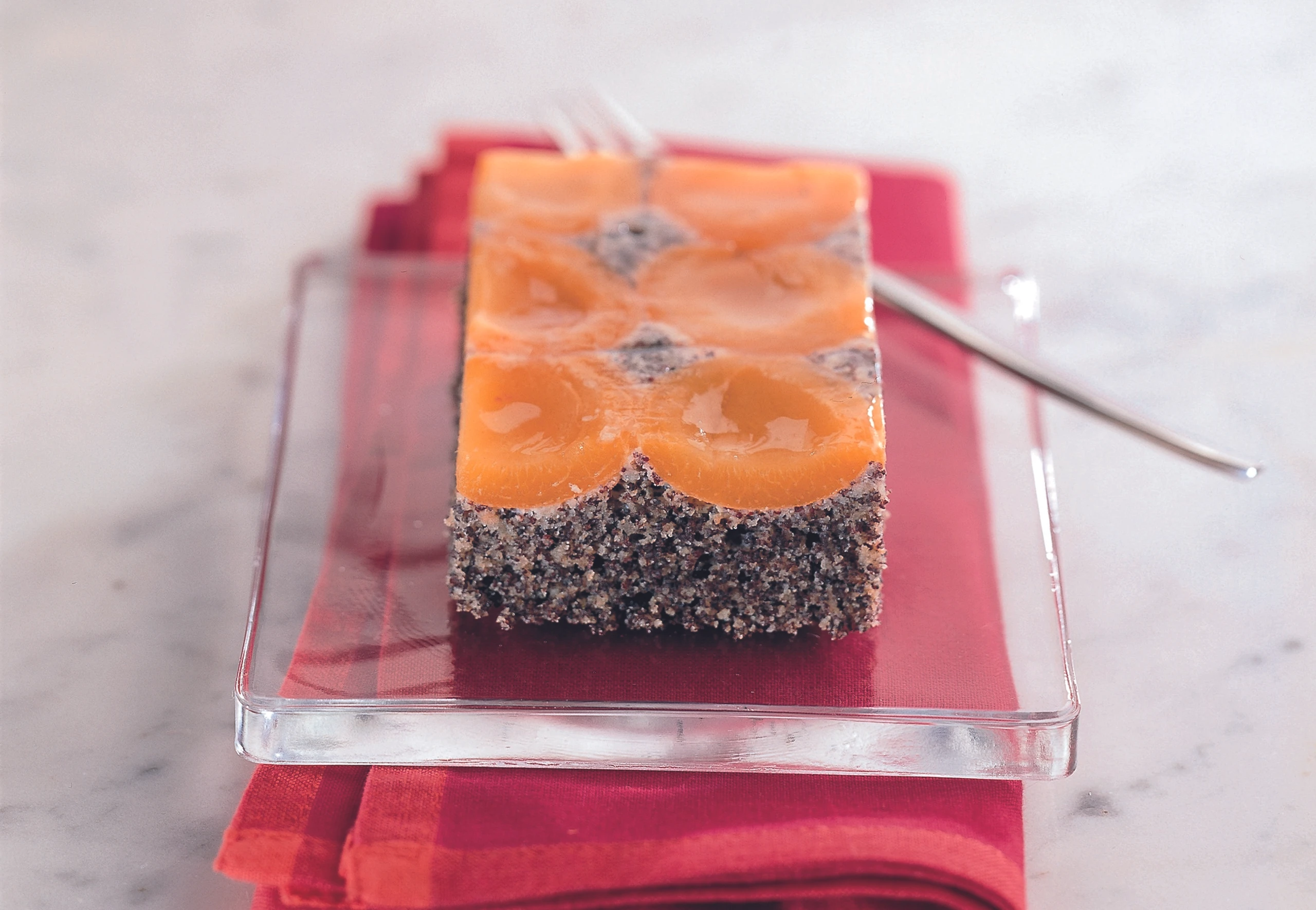 Kuchen aus dem Rohr nehmen, auskühlen lassen und mit Hilfe eines zweiten Bleches umdrehen – die Marillen sind nun oben.
