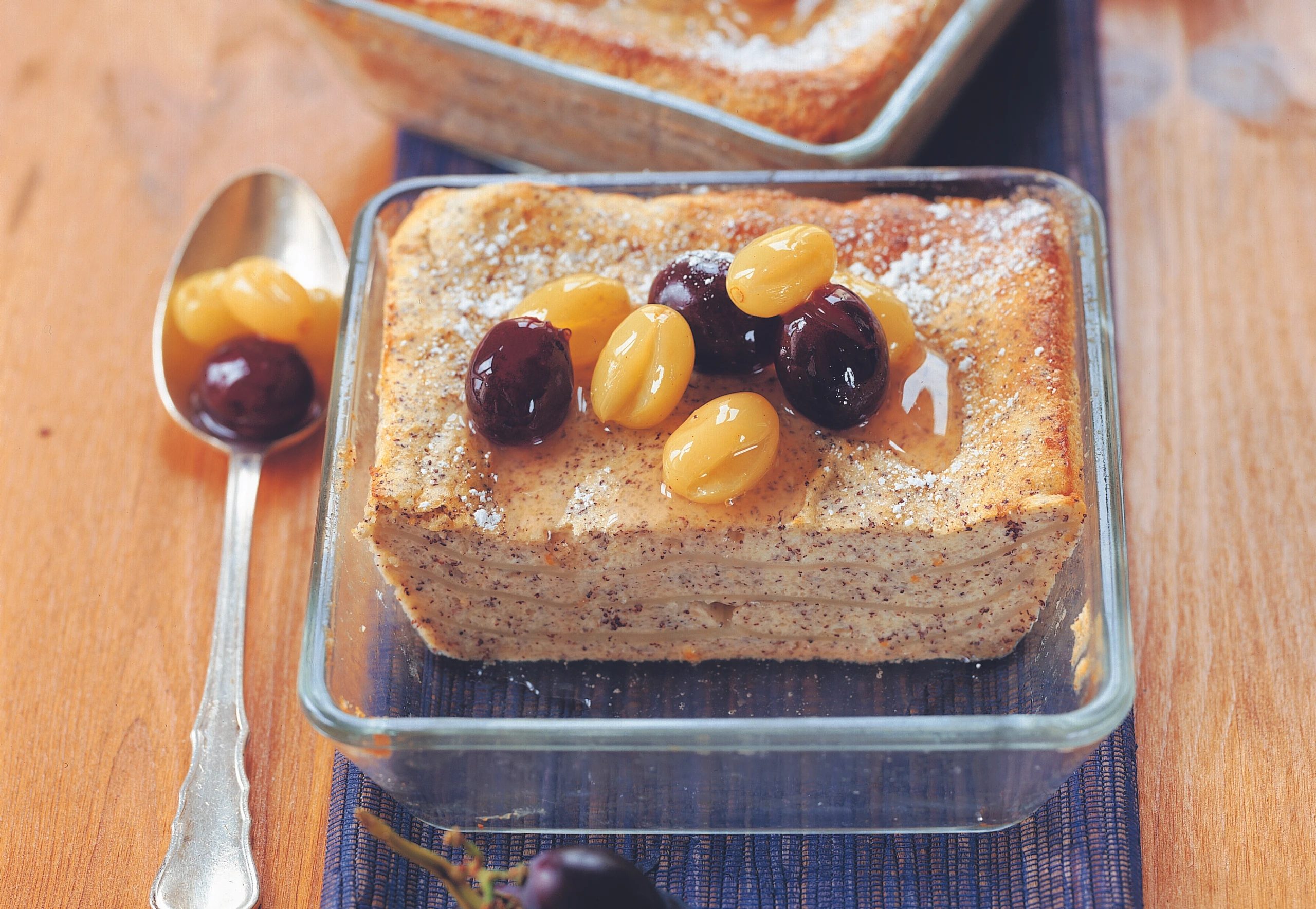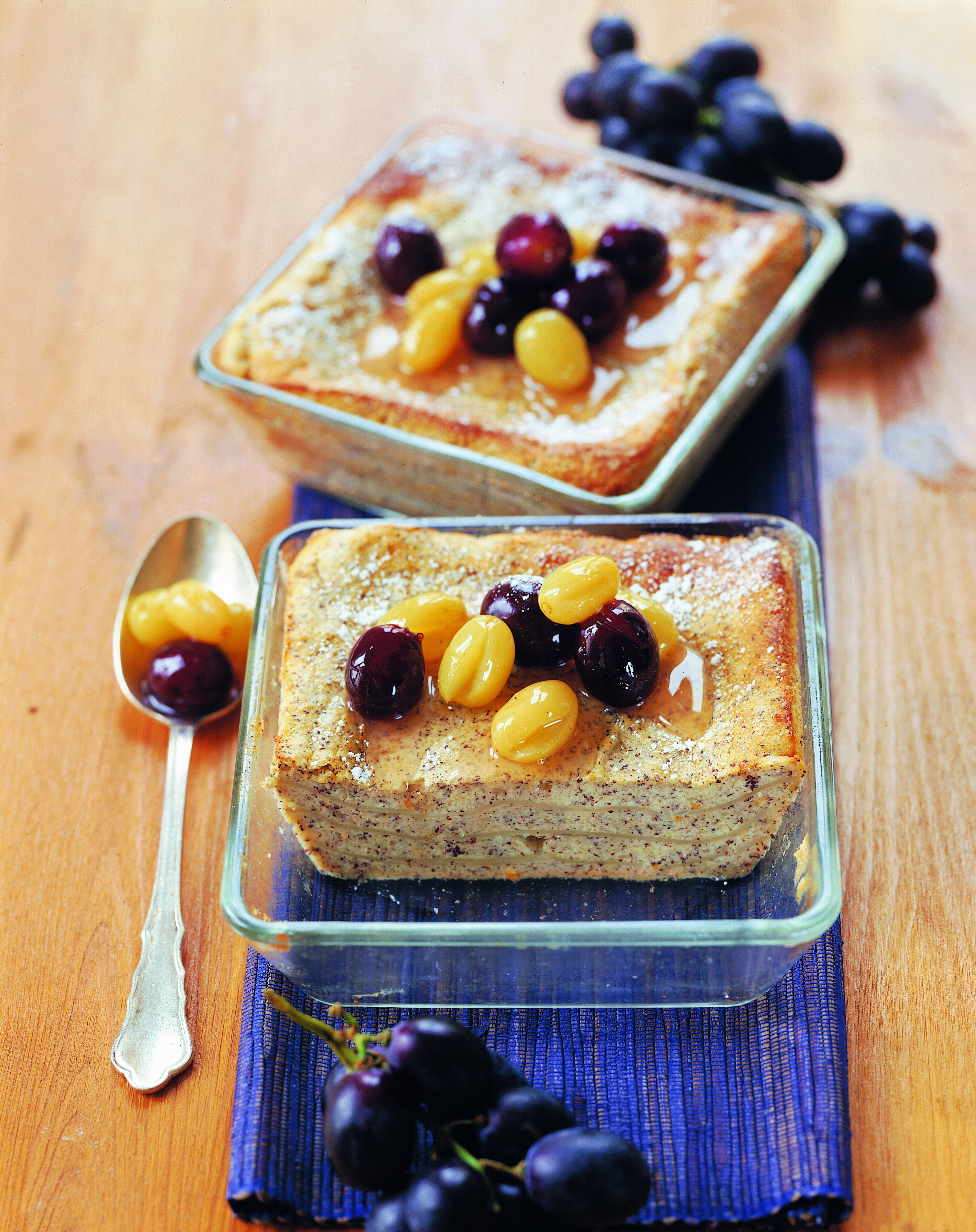 5/6Größere Trauben halbieren. Stärke mit 2 EL vom Apfelsaft glatt rühren. Übrigen Apfelsaft und Wein aufkochen, Stärkemischung einrühren und ca. 1 Minute köcheln.