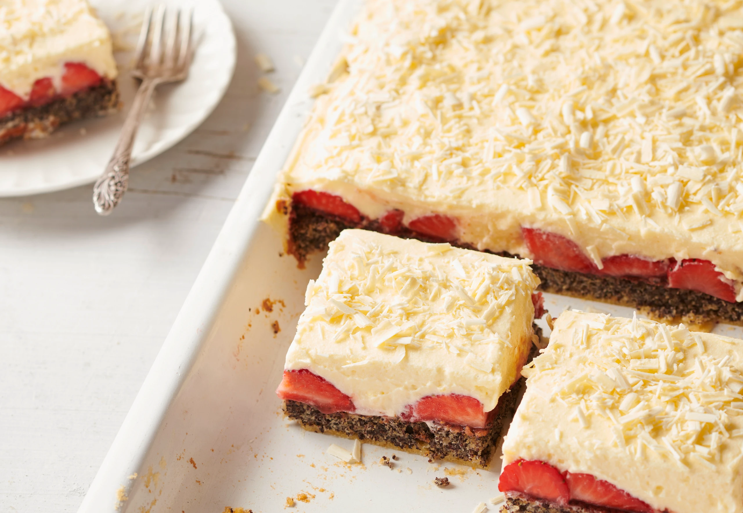 Für den Mohnboden Eier in Dotter und Klar trennen. Eiklar zu cremigem Schnee schlagen. Butter und Zucker ca. 5 Minuten cremig mixen. Dotter einzeln zugeben und untermixen. Mohn, Nüsse und Milch einrühren, Schnee unterheben.