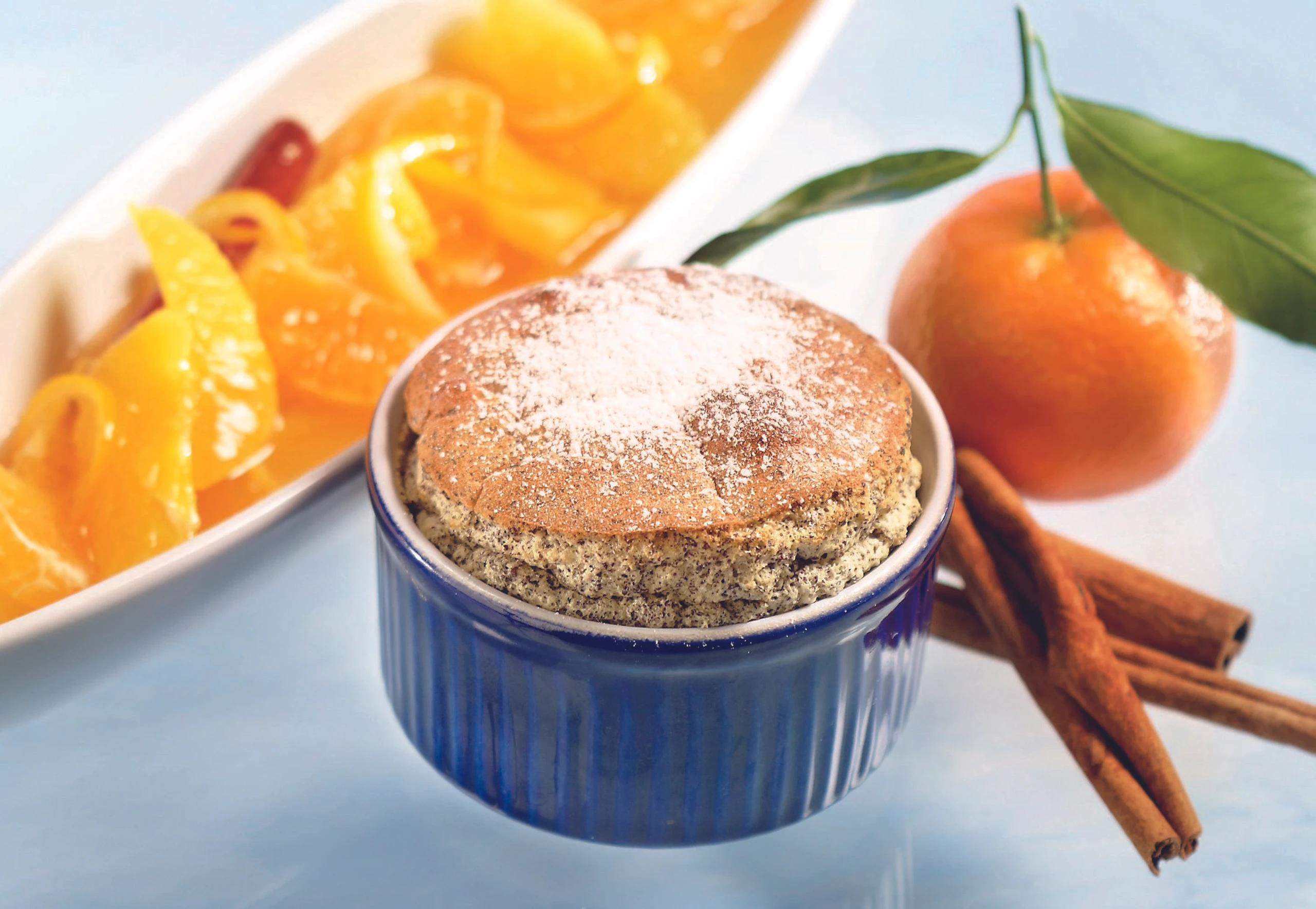 Für das Soufflé in einem kleinen Topf Milch, Zucker, Vanillezucker, Stärke, Zitronenschale und TL Zimt mit dem Schneebesen verrühren und unter Rühren aufkochen. Mohn einrieseln lassen und unter Rühren 1 Minute kochen. Masse vom Herd nehmen. Eier in Dotter und Klar trennen. Dotter mit dem Mixer nacheinander unterrühren, Masse in einem Wasserbad abkühlen lassen.