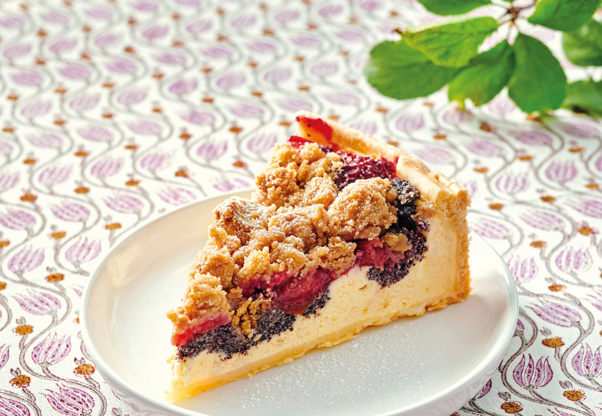 Rohr auf 180 °C Ober-/Unterhitze vorheizen. Topfenmasse in der Form verstreichen. Mohnmasse löffelweise darauf verteilen. Mit den Zwetschken belegen und mit Streusel bedecken.