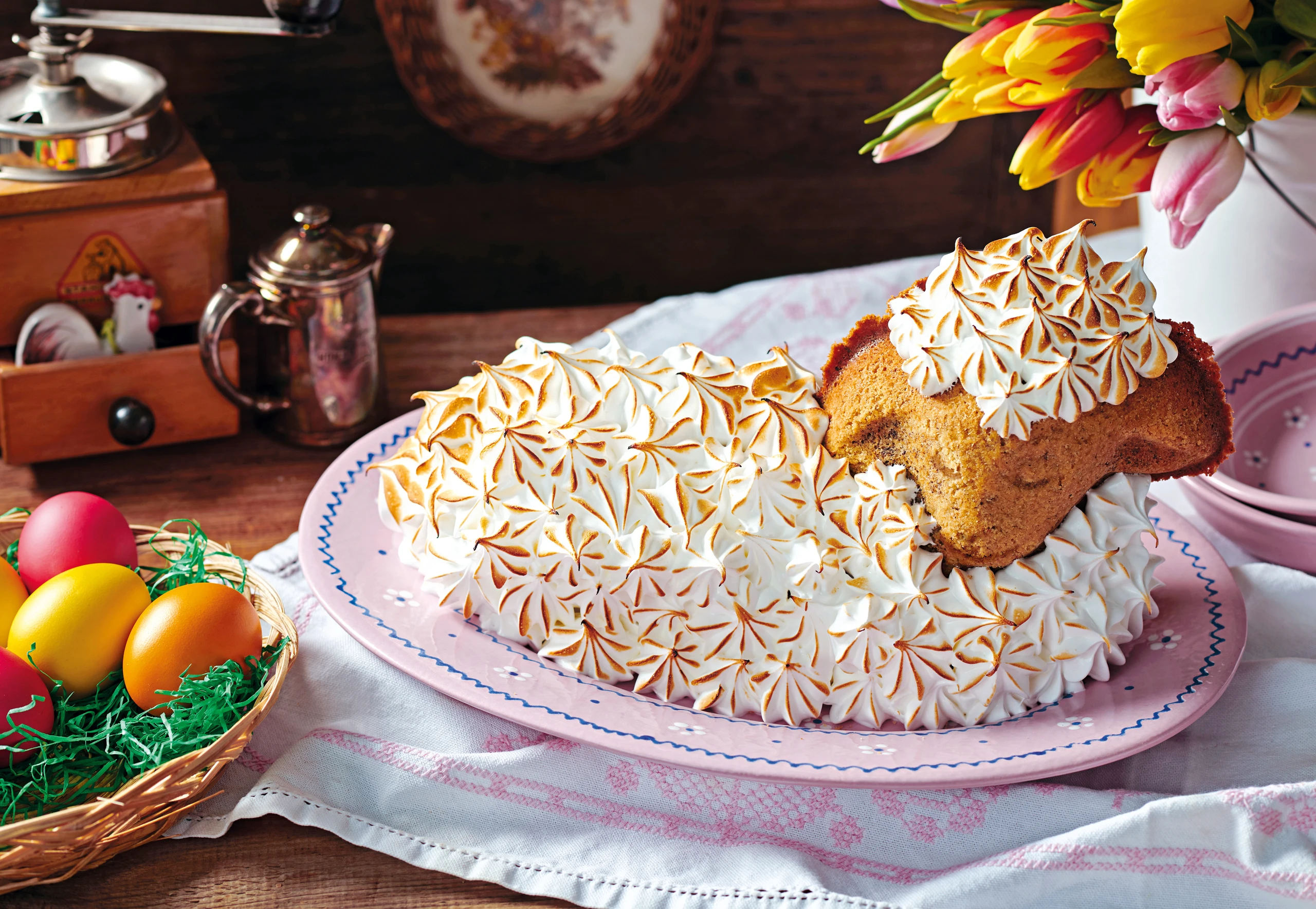 Für das Baiser Eiklar und Zucker über einem Wasserbad verrühren, bis sich der Zucker auflöst. Masse zu steifem Schnee schlagen. Baiser in einen Dressiersack mit Sterntülle füllen und das Schaf damit dekorieren. Mit dem Bunsenbrenner abflämmen oder im Rohr bei 200°C goldbraun backen.