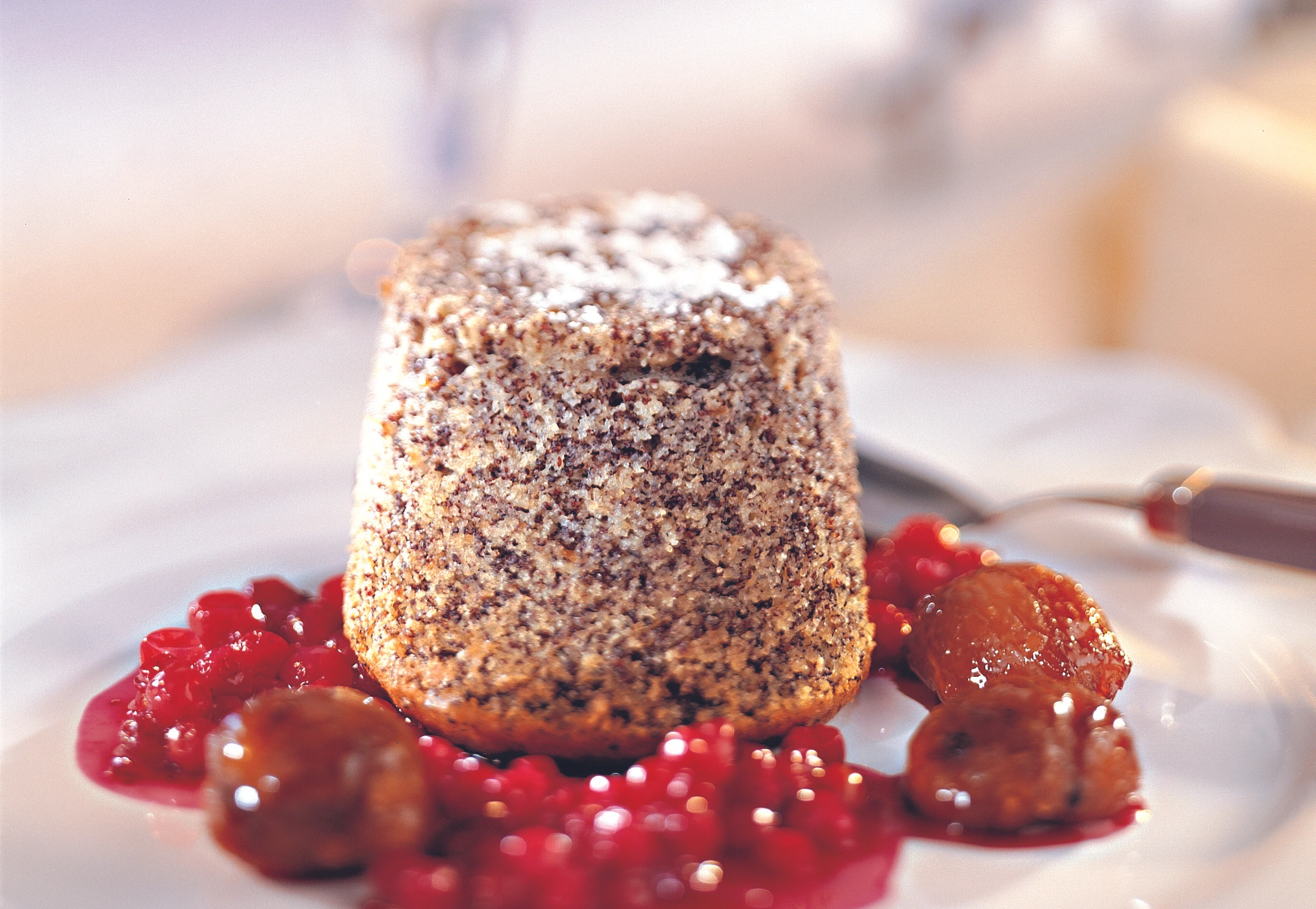 Mohnauflauf mit Preiselbeeren und Karamell-Maroni