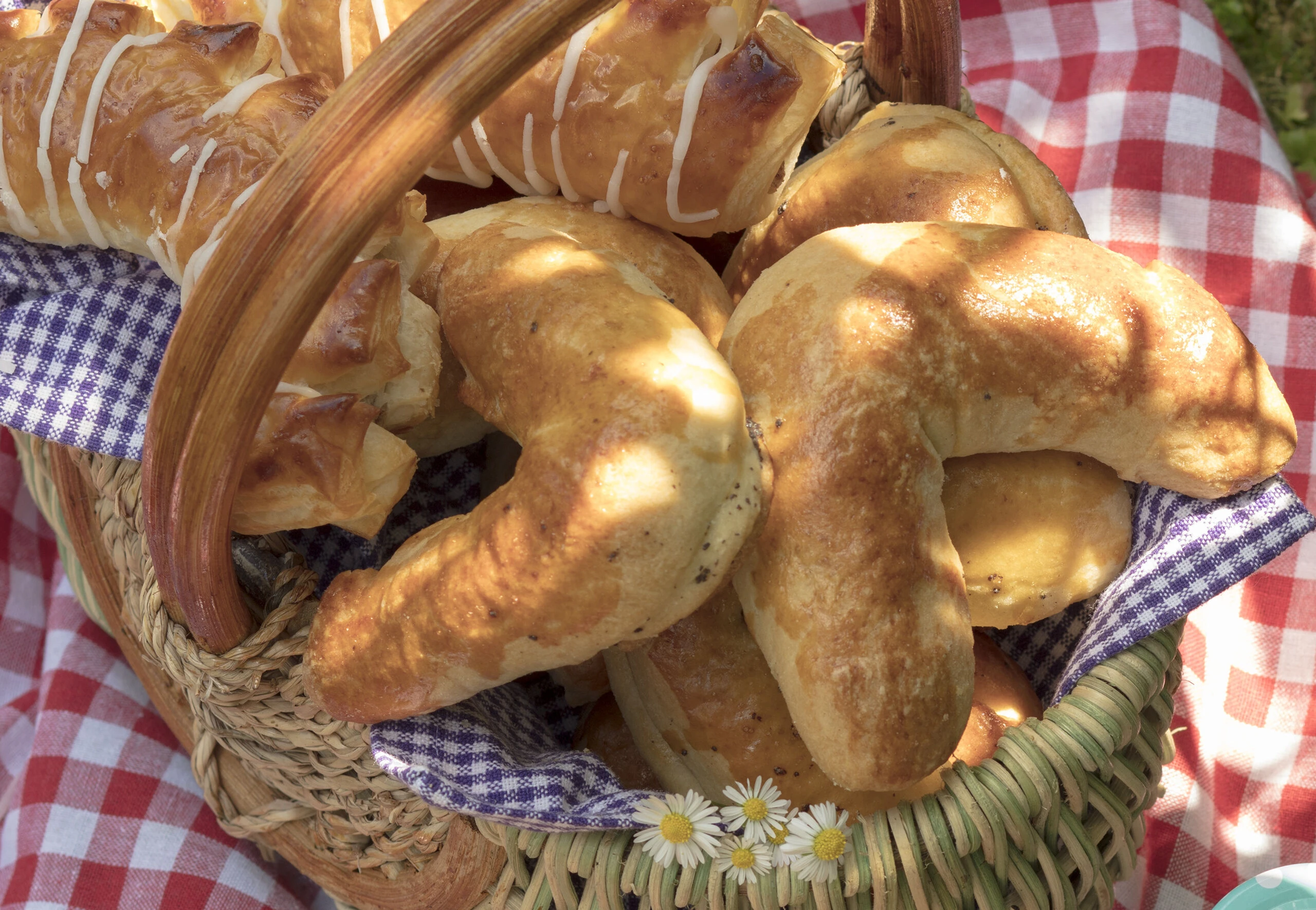 Rohr auf 180°C vorheizen. Backbleche mit Backpapier belegen. Teig auf einer bemehlten Arbeitsfläche in gleichgroße Stücke teilen. Jedes Teigstück oval ausrollen und ca. 50 g von der Fülle darauf geben. Teig über die Fülle einschlagen, andrücken und zu einem Beugel formen. Mit der Naht nach unten auf ein Blech legen und mit Ei bestreichen. Beugel im Rohr (mittlere Schiene) ca. 20 Minuten backen. Herausnehmen und auskühlen lassen.