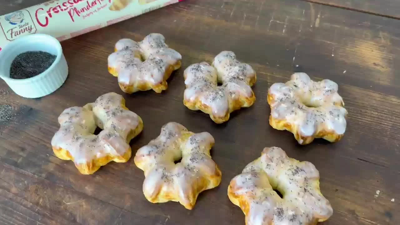 Für den Guss Staubzucker mit Milch und Marmelade glatt verrühren. Blumen in den Guss tunken, abtropfen lassen und mit Mohn bestreuen.