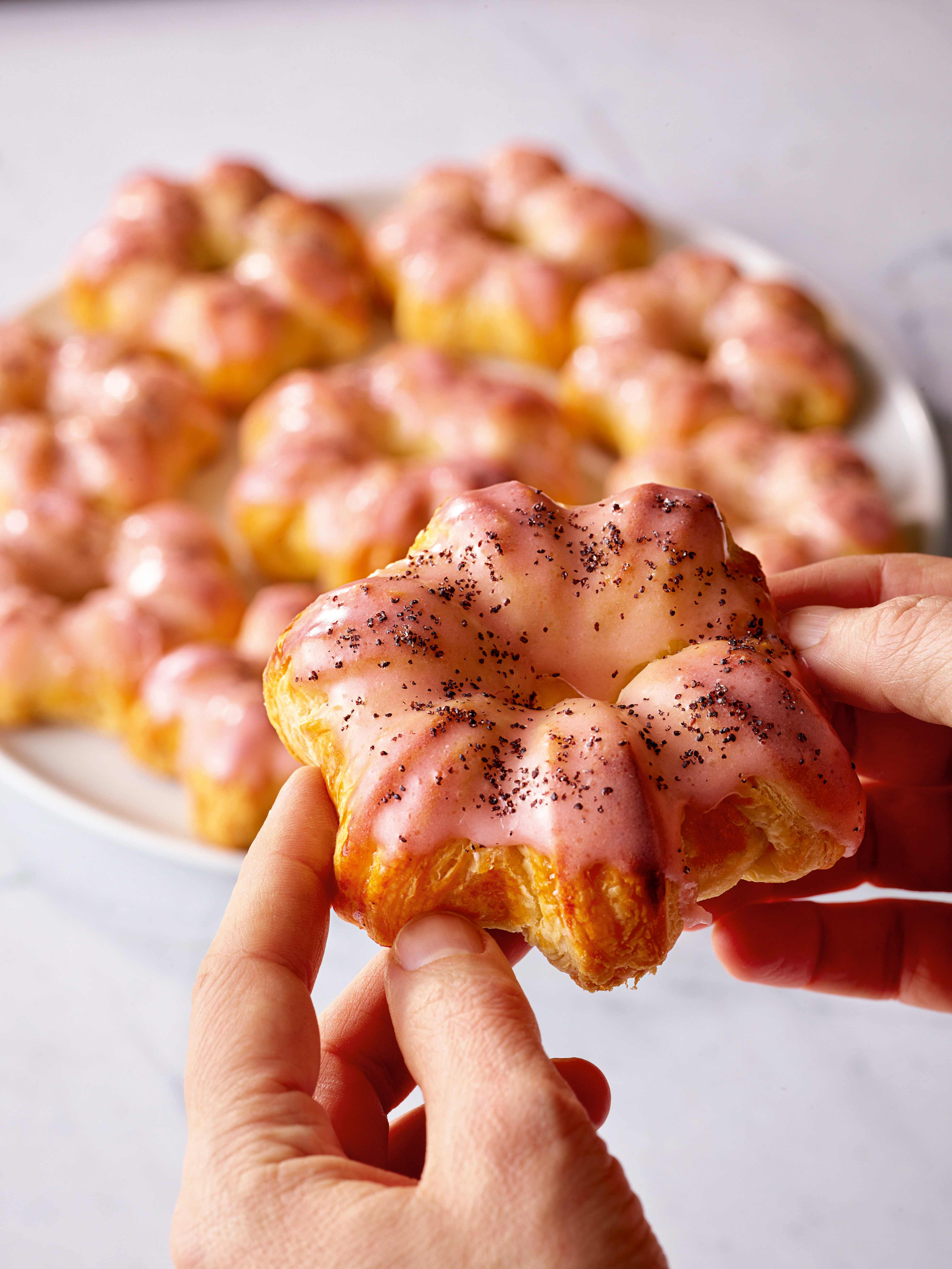 Teig aufrollen und in 6 Stücke (12 x 12 cm) schneiden. Mohnfülle auf das obere Drittel eines Teigstücks dressieren. Teig von oben über die Fülle klappen und leicht andrücken. Untere Teighälfte fünf Mal senkrecht bis zur Fülle einschneiden. Teig vollständig aufrollen und mit einem Holzstäbchen zwischen den Einschnitten eindrücken. Rolle zu einem Kranz formen, Enden zusammenzwicken und verschließen. Mit den Fingerspitzen Blütenblätter formen. Vorgang mit restlichen Teigstücken wiederholen.