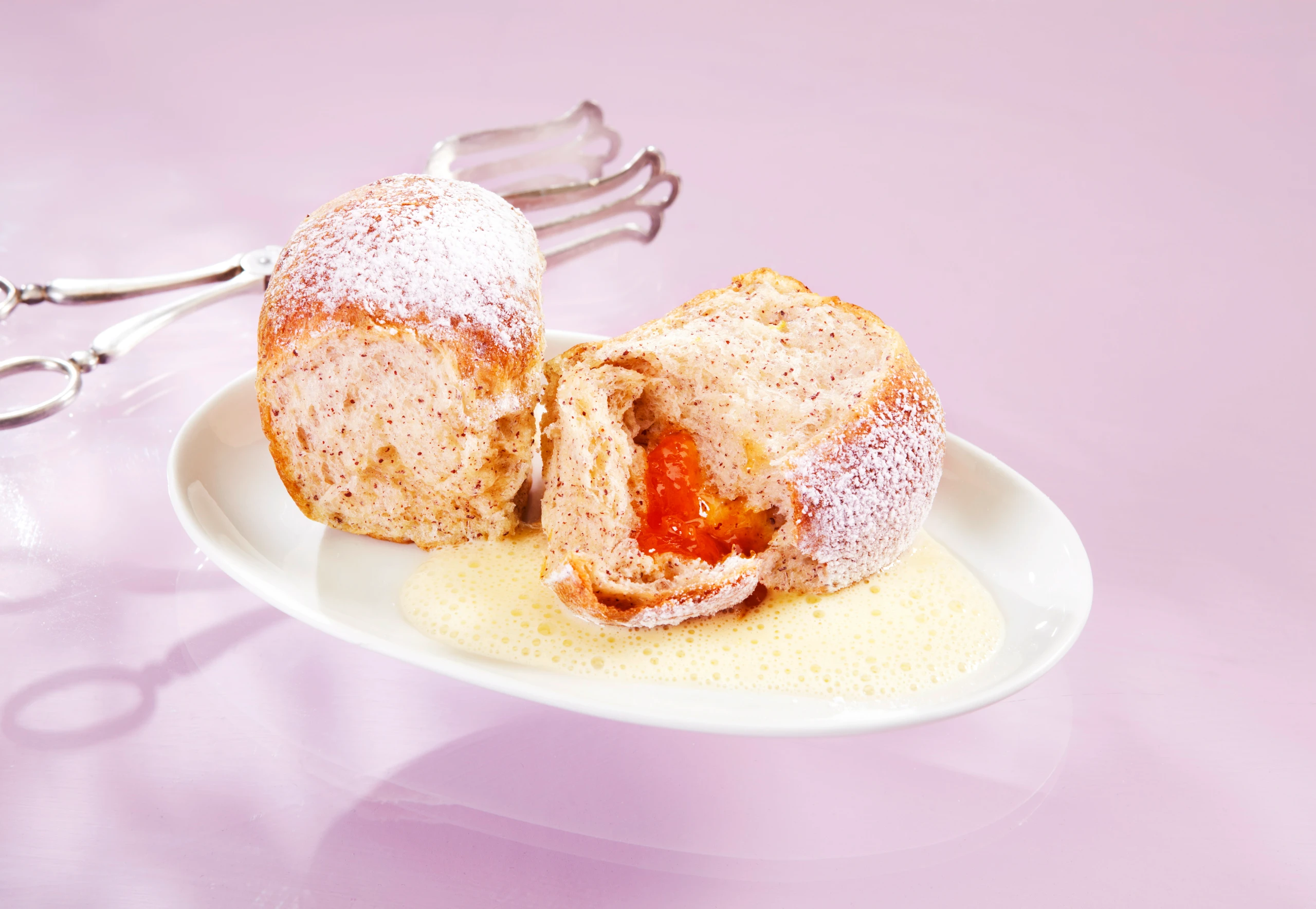 Mohnbuchteln mit Marillenmarmelade und Vanillesauce