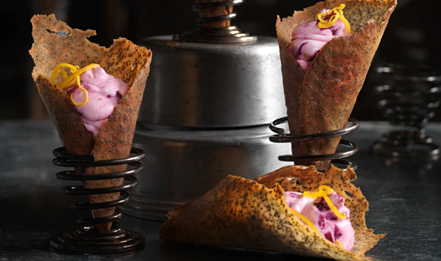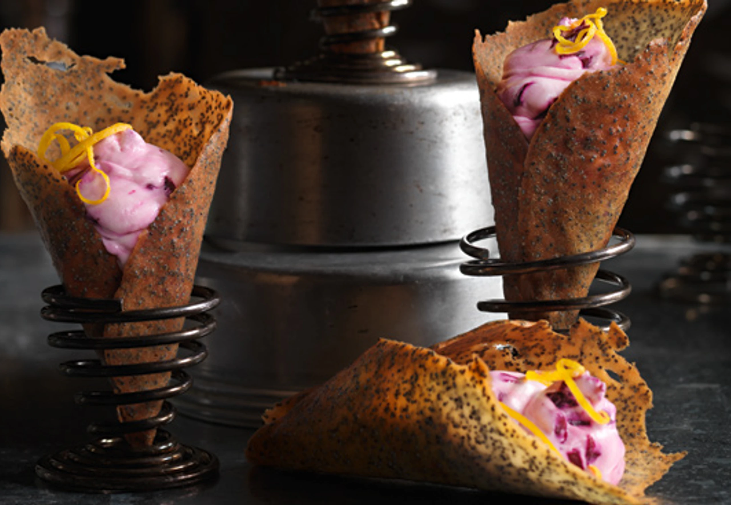 Butter mit 100 g Staubzucker, Mehl, Mohn und Eiklar verrühren. Schablone auf das Backblech legen. Hippenmasse dünn in die Öffnung streichen, Schablone abheben und 4 weitere Teigscheiben auf das Blech streichen. Teigscheiben im Rohr (mittlere Schiene) ca. 5 Minuten backen, herausnehmen, sofort zu Stanitzeln formen und auskühlen lassen. Übrigen Teig ebenso verarbeiten.