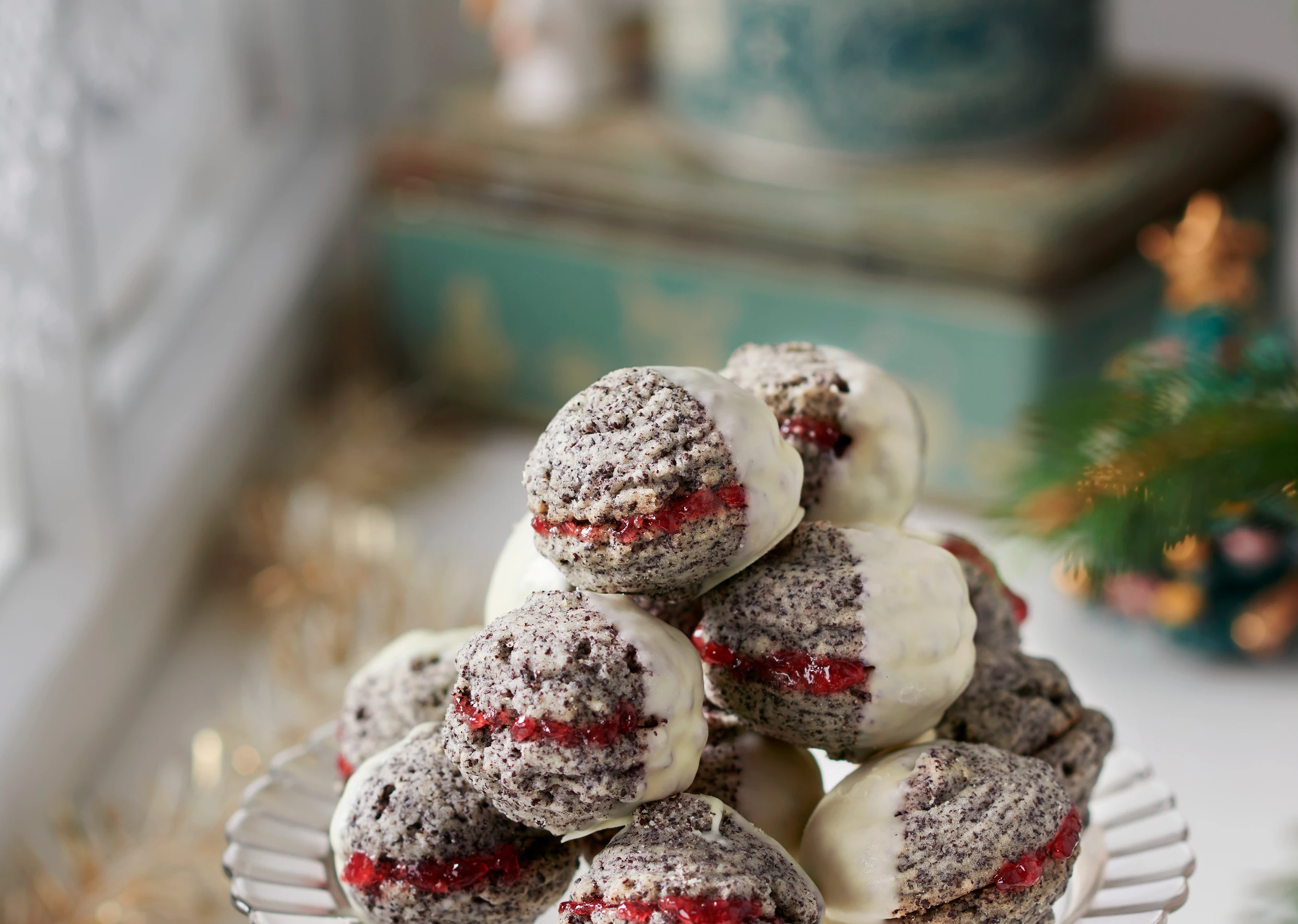 Kuvertüre und Kokosfett über einem Wasserbad schmelzen und die Kekse bis zur Hälfte eintunken. Auf Backpapier trocknen lassen. Mohnkekse in einer Blechdose aufbewahren.