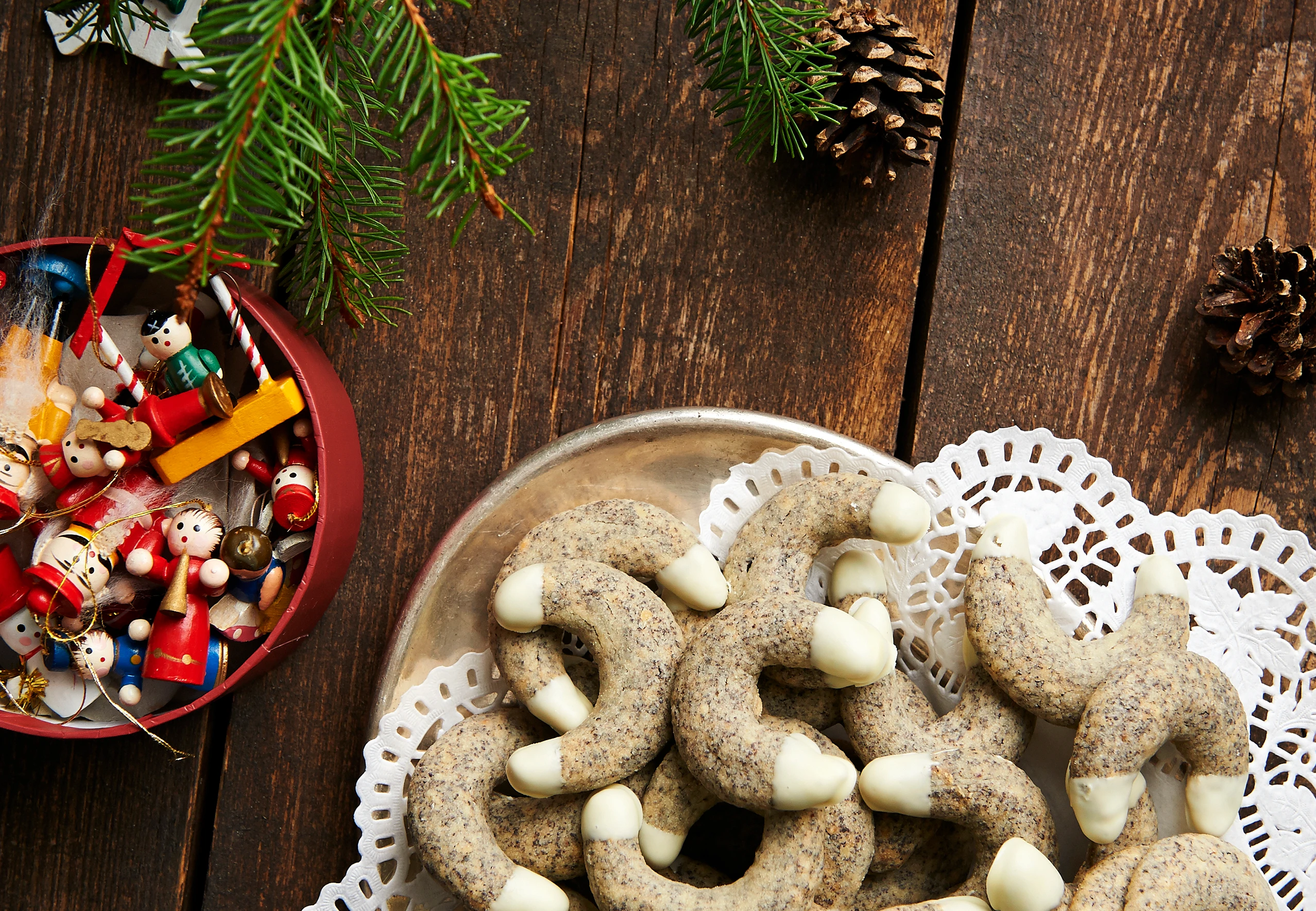 Für die Glasur Kuvertüre über einem Wasserbad schmelzen und die Enden der Kipferl eintunken. Auf Backpapier anziehen lassen.