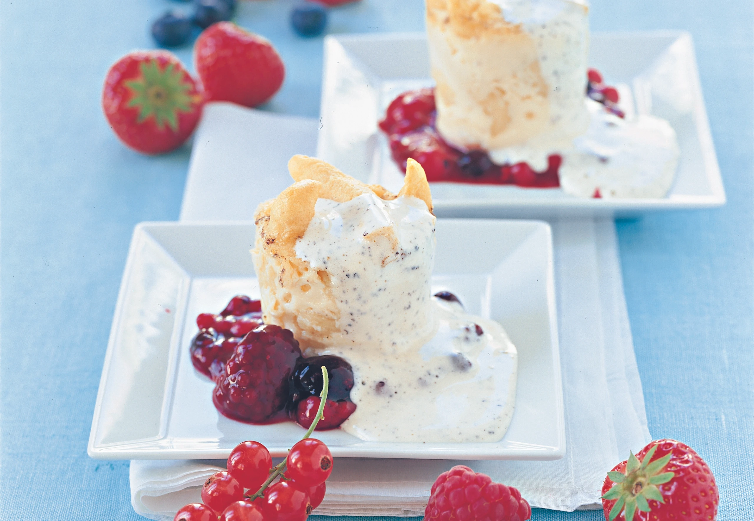 Aufläufe auf Teller stürzen, mit dem Mohnsabayon und den marinierten Beeren garniert servieren.
