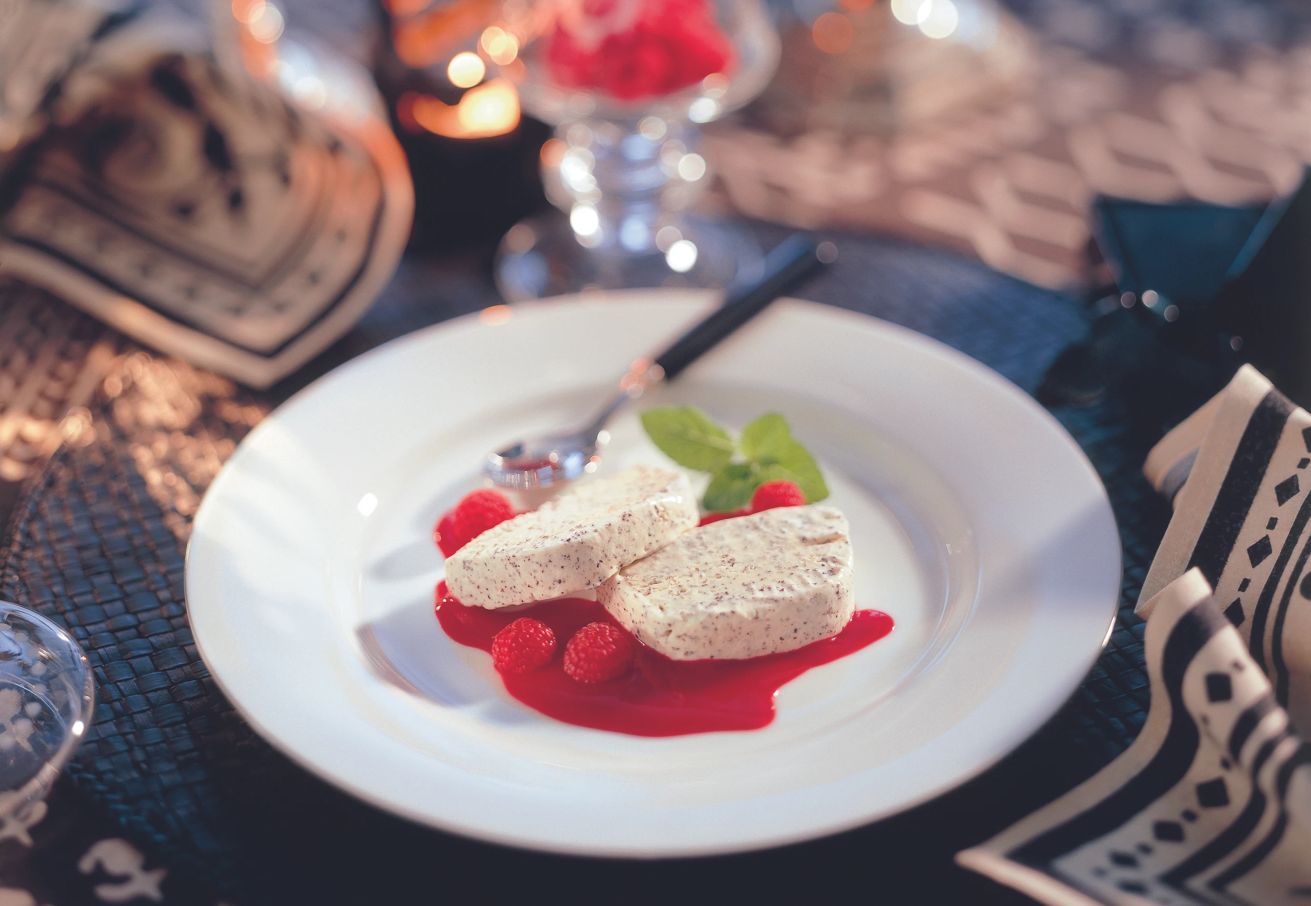 Vor dem Servieren Parfait aus der Form stürzen, Folie abziehen und das Parfait in Scheiben schneiden. Mit Himbeersauce anrichten, mit Himbeeren und Minzeblättern garnieren.