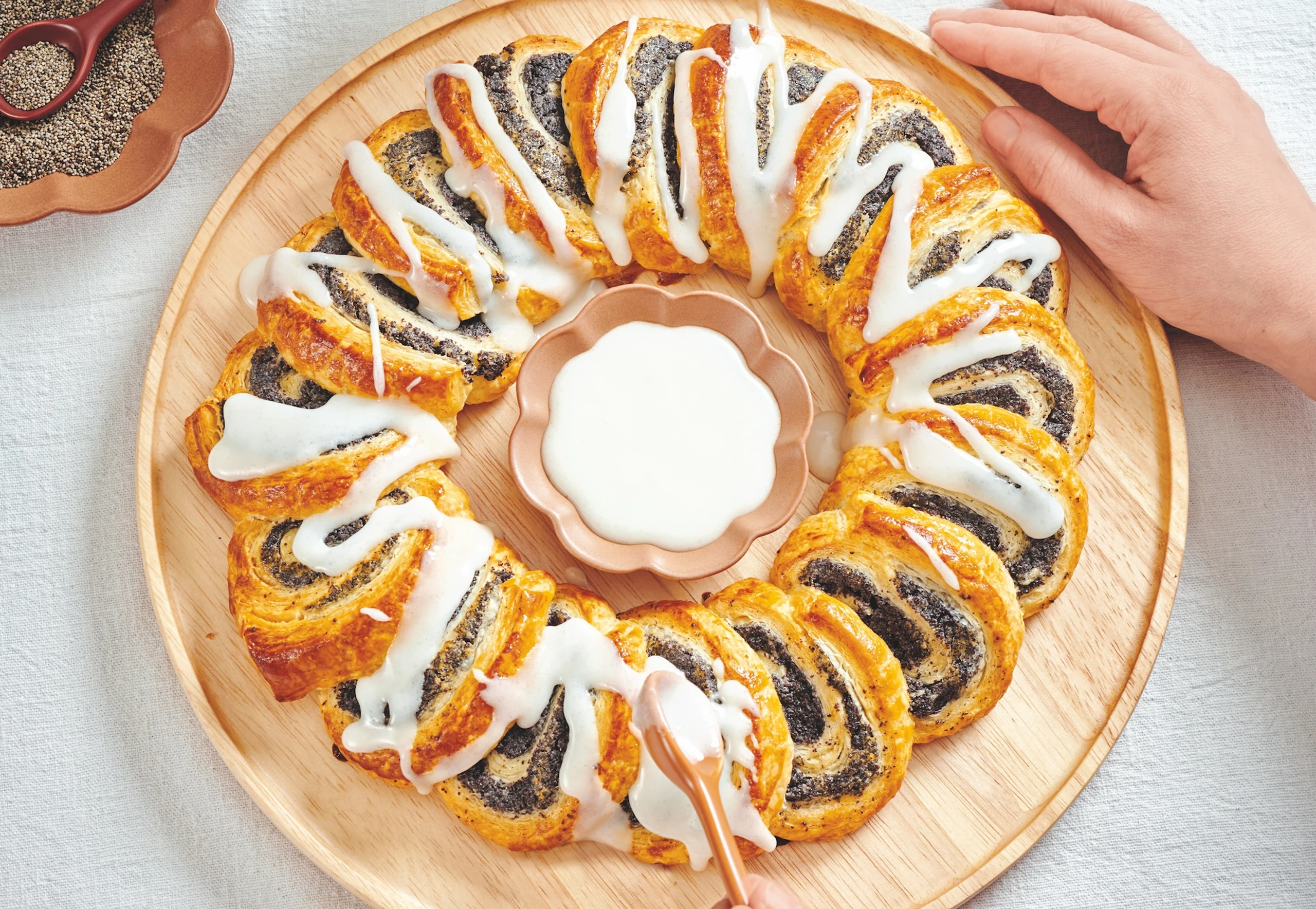 Teigrolle herausnehmen und in 16 Stücke schneiden. Mohnschnecken leicht überlappend zu einem Kreis auf das Blech legen. Dotter und Obers verrühren und den Kranz damit bestreichen. Im Rohr (mittlere Schiene) ca. 30 Minuten goldbraun backen. Herausnehmen und auskühlen lassen.