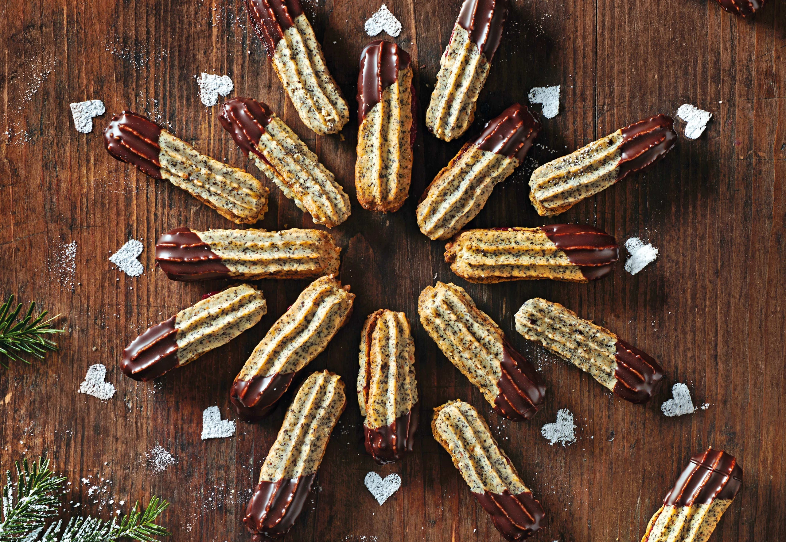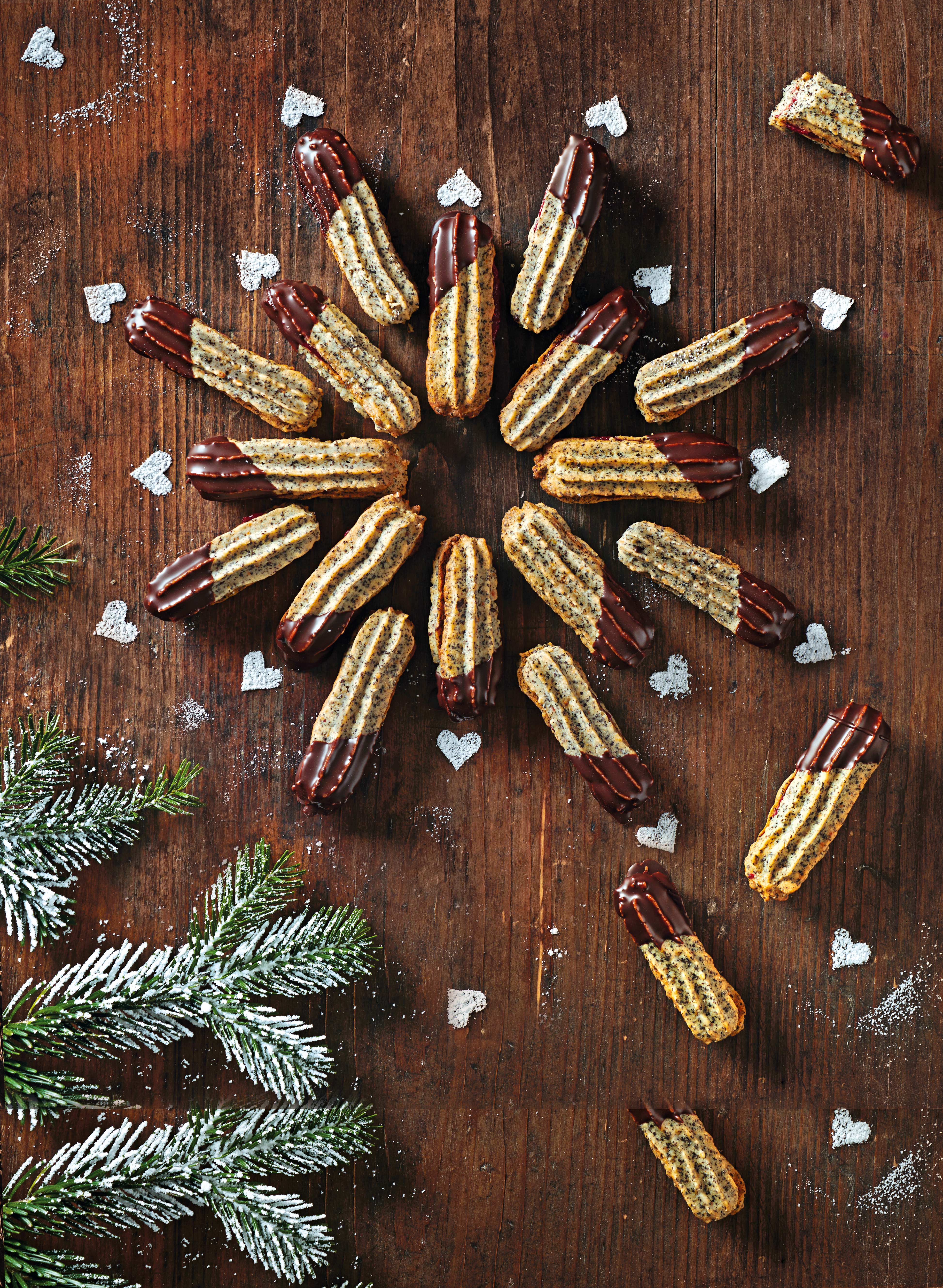 Kuvertüre und Kokosfett über einem Wasserbad schmelzen. Mohnstangerl zu einem Drittel in die Schoko tunken, gut abtropfen lassen und auf Backpapier trocknen lassen.