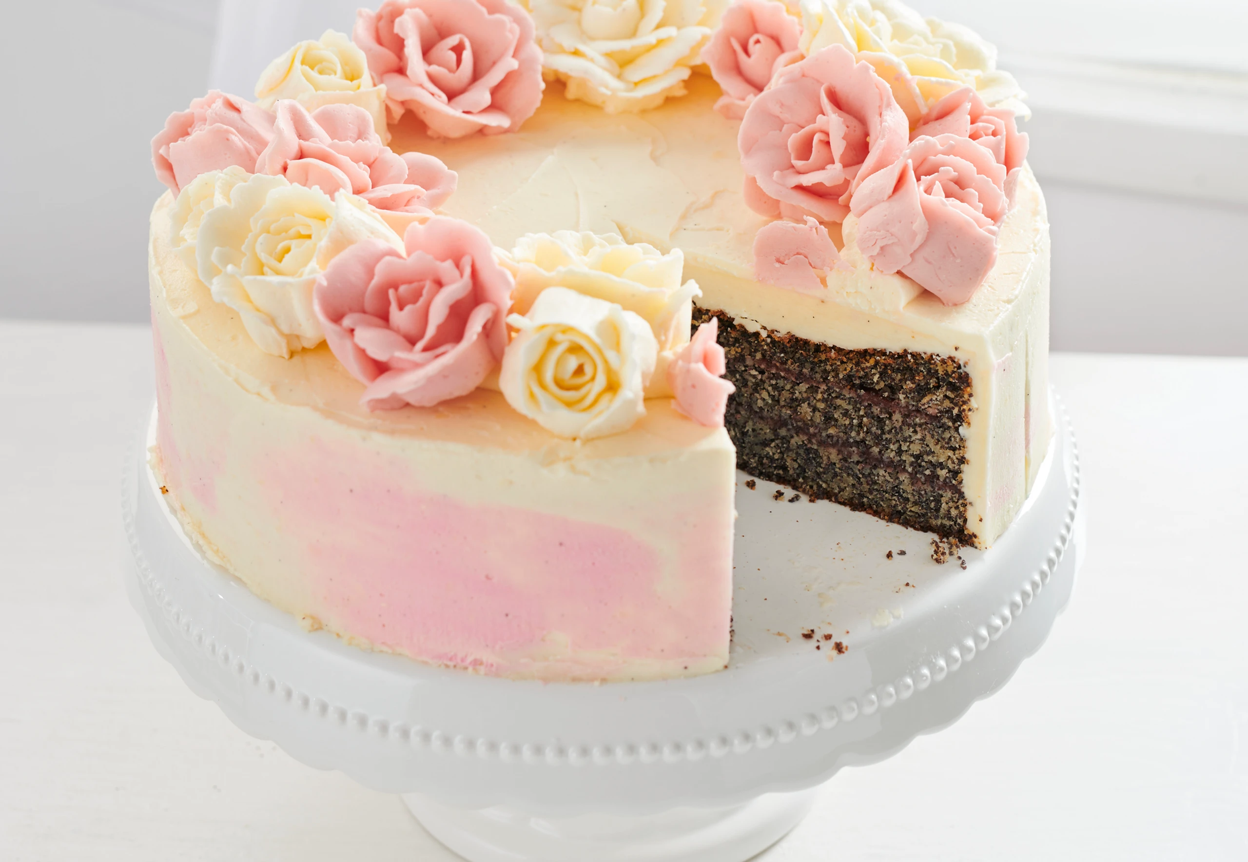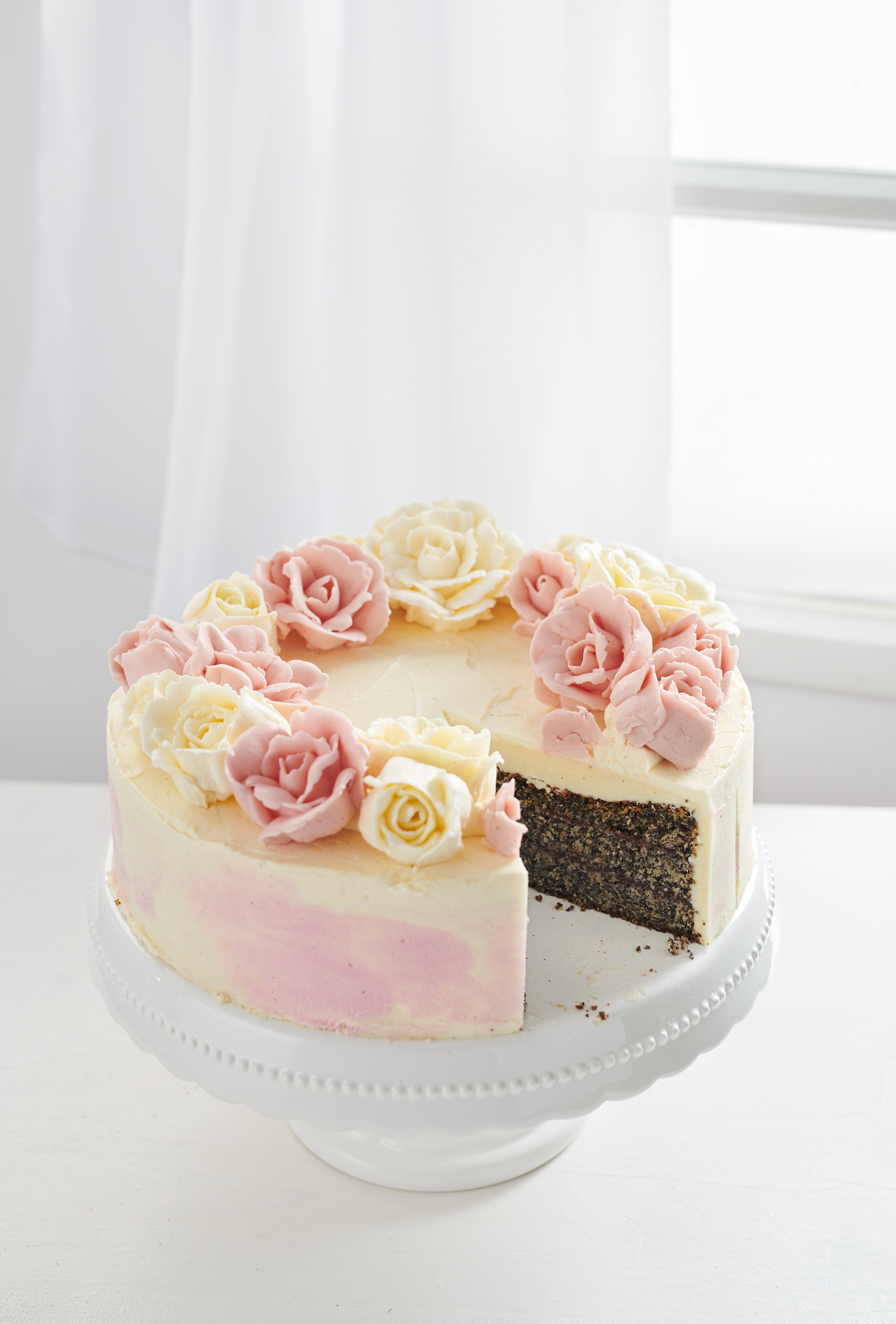 Mohntorte mit Buttercreme-Blüten