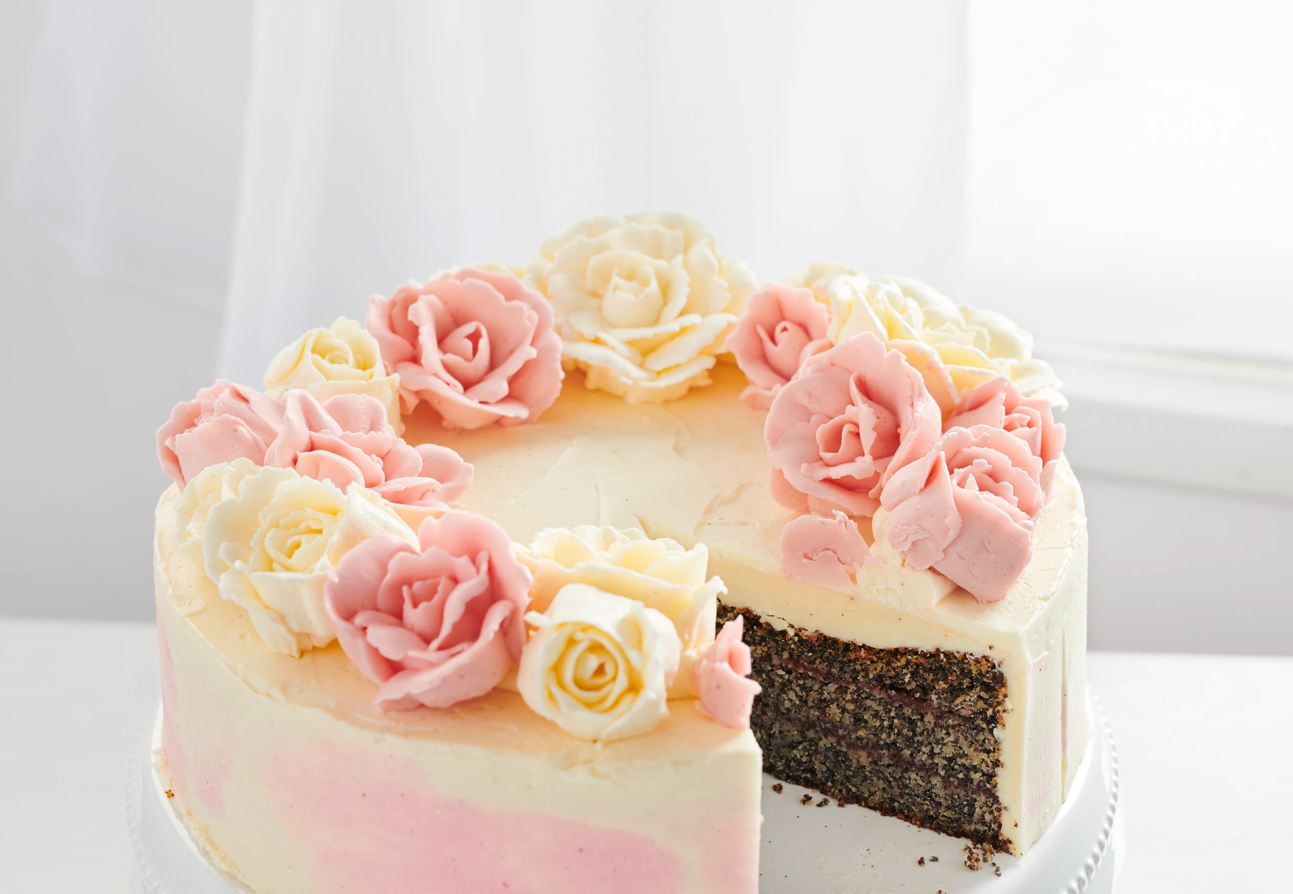 Mit einer speziellen Tülle (Gerade Petal-Tülle, JEM 127) weiße und rosa Rosenblüten auf ein Stück Backpapier dressieren. Blüten ca. 30 Minuten tiefkühlen, so lassen sie sich leichter auf die Torte setzen.
