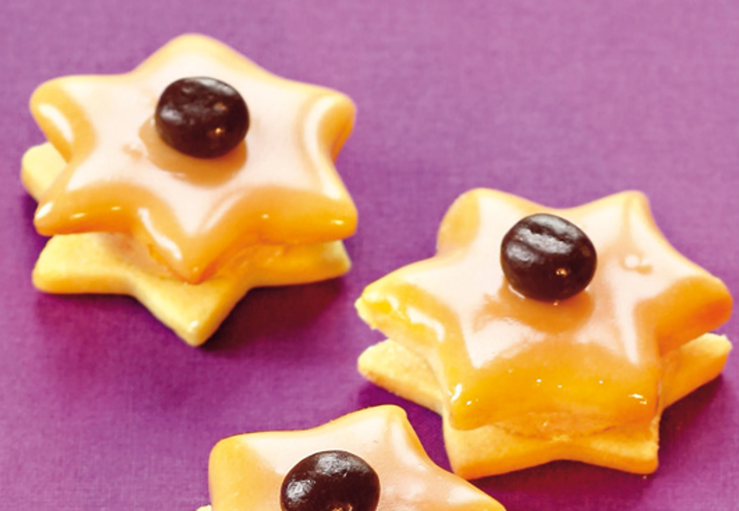 Für die Glasur Zucker, Likör und Mokka verrühren. Je 2 Sterne mit Fülle zusammensetzen, mit Marmelade bestreichen, mit Glasur überziehen, mit Bohnen garnieren.