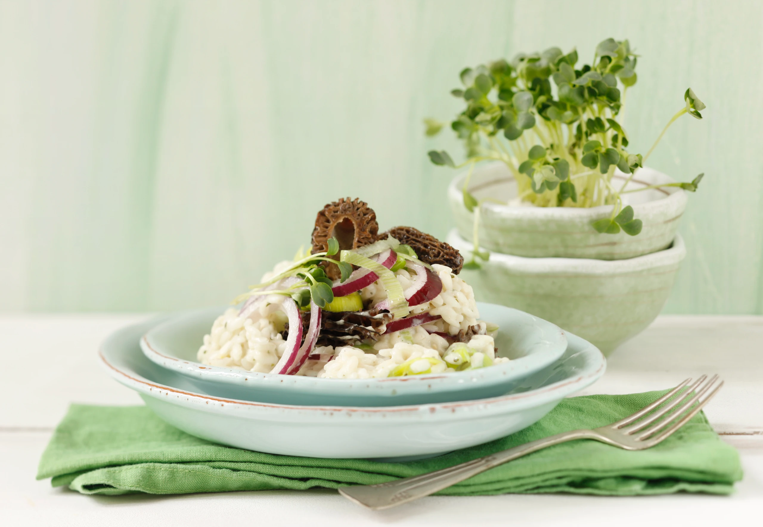 Wein und übrige Suppe nach und nach zugießen und das Risotto unter Rühren bissfest garen. Lauch und Morcheln unterrühren, Risotto mit Salz und Pfeffer würzen. Risotto mit Parmesan und Butter vermischen und mit Kresse garniert servieren.