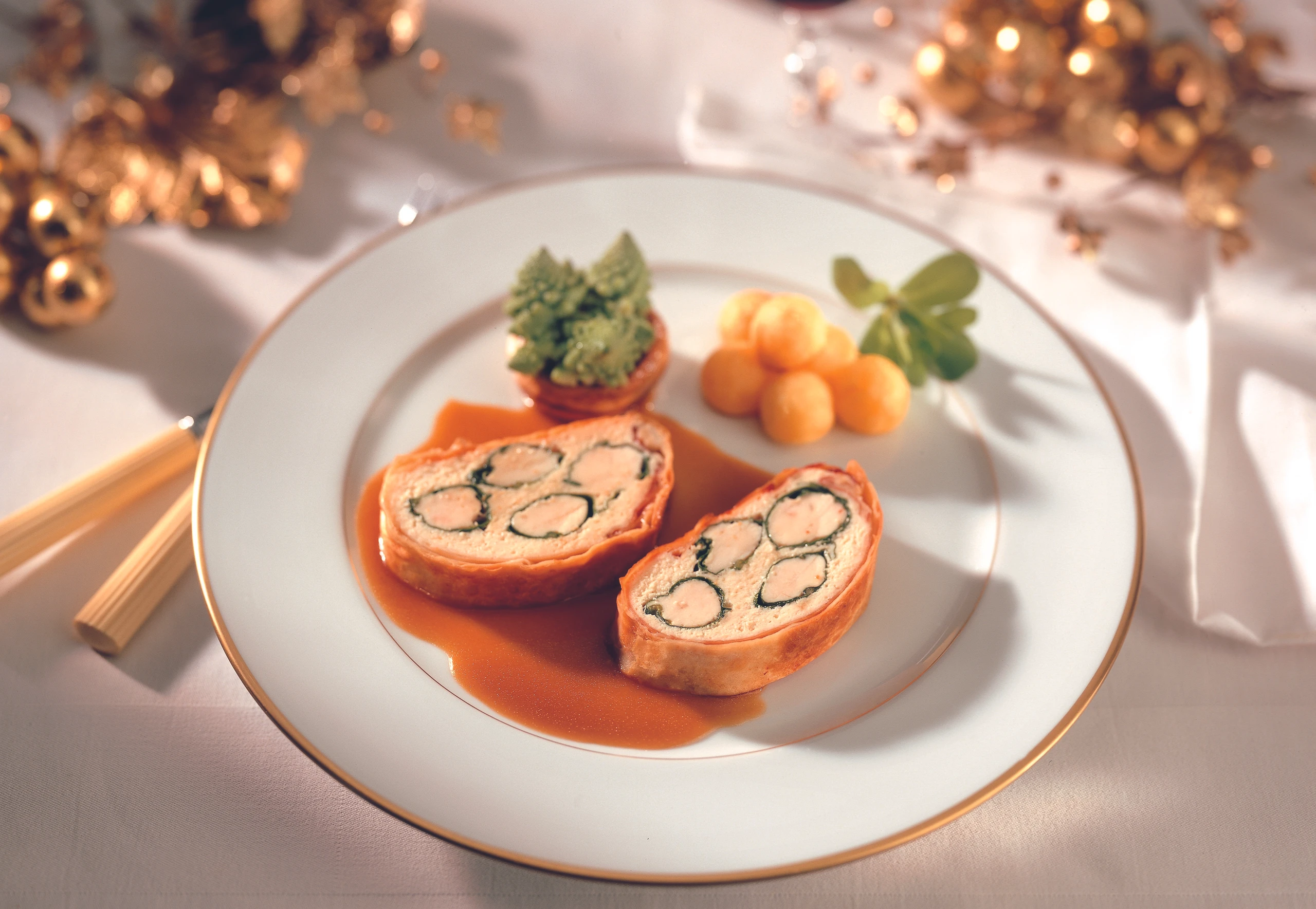 Schinkenblätter quer halbieren. Spinat entstielen, waschen, in Salzwasser kurz überkochen und abschrecken. Spinatblätter auf einem Tuch aufbreiten. Filet-Streifen mit Salz, Pfeffer und Majoran würzen und in die Spinatblätter wickeln.