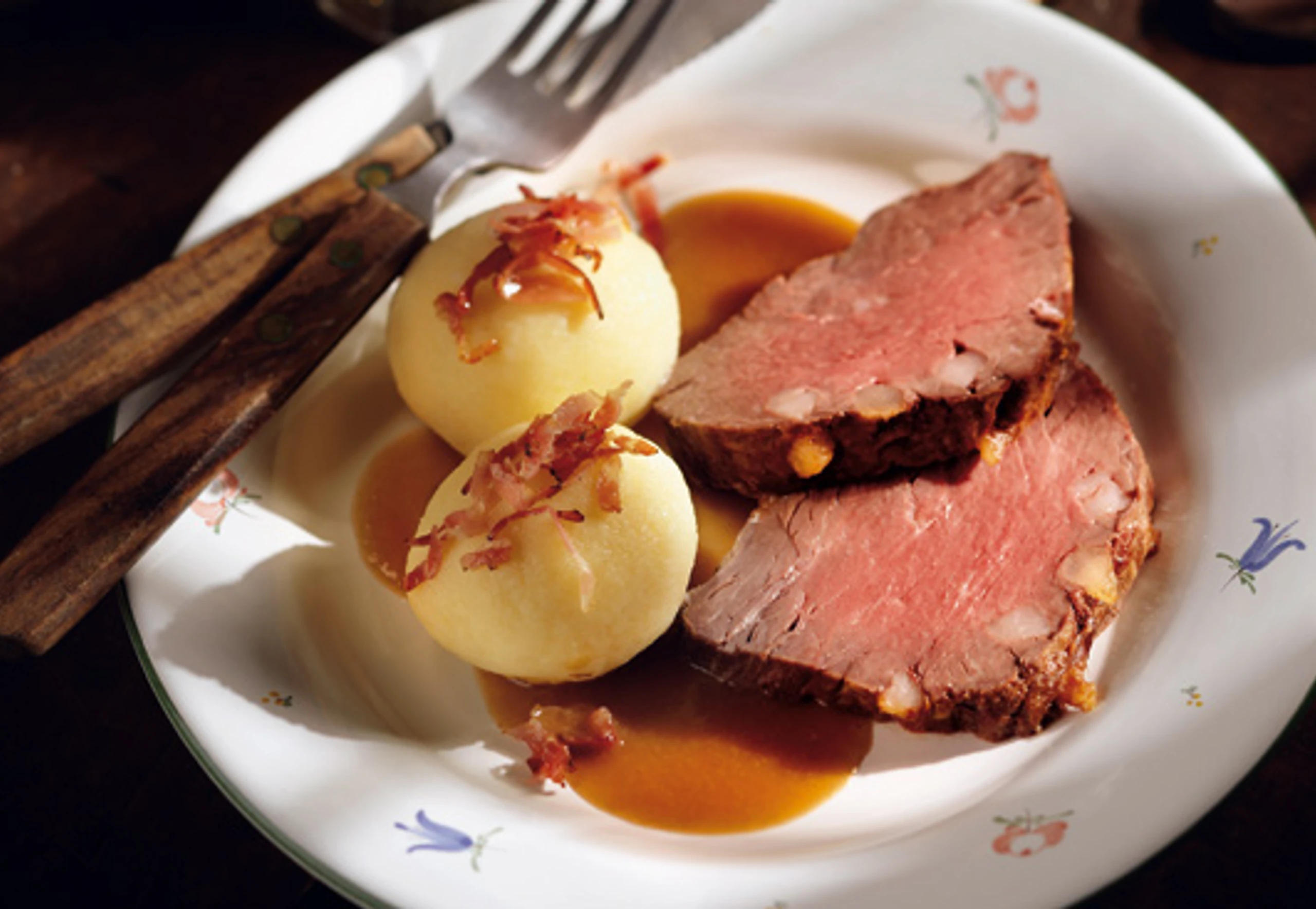 - 100 g Speck in Streifen schneiden und in Öl braten. Fleisch mit Sauce und Knödeln anrichten. Knödeln mit Speck bestreuen.