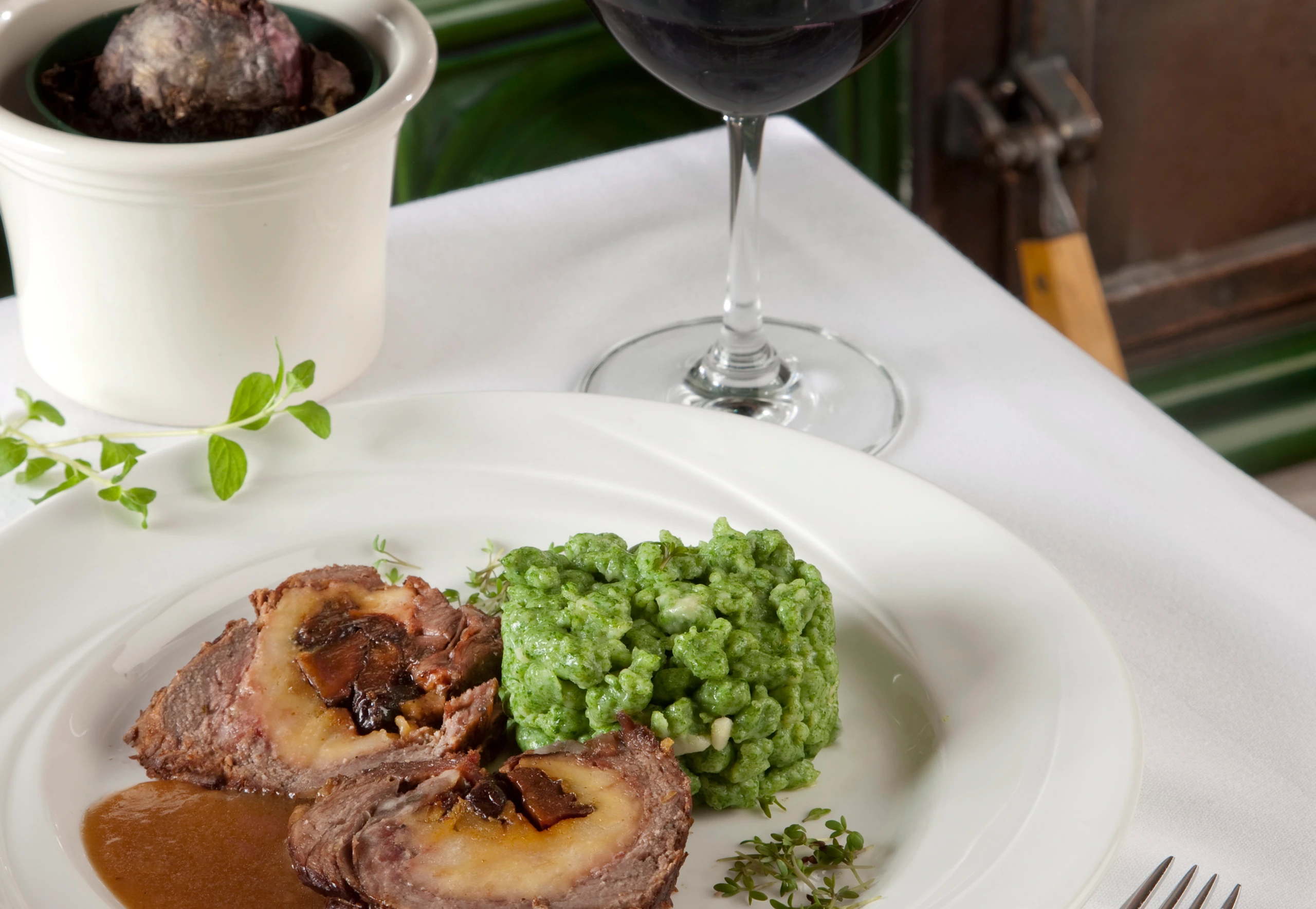 Mostbratl mit Zwetschken-Kletzenfülle und Brennessel-Spatzen