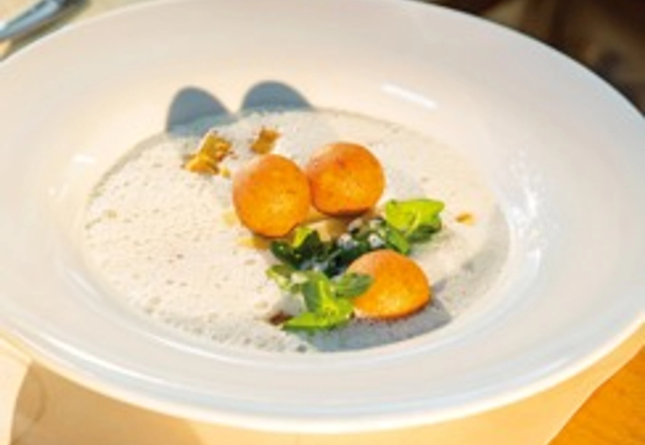- Teig zu einer Rolle formen, Scheiben abschneiden, Fülle darauf geben und zu Knödeln formen. Knödel in Öl schwim mend backen, herausheben und abtropfen lassen. Suppe mit Knöderln anrichten.